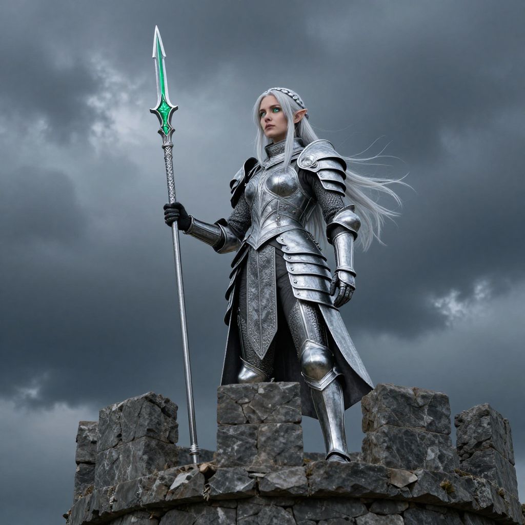 Silver haired elf female guardian standing vigilant atop an ancient stone tower, her silver hair braided with silver threads, sharp emerald eyes, clad in ornate silver armor that gleams against the stormy sky, holding a long, elegant spear with emerald accents.