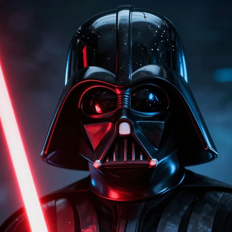 Photorealistic digital artwork of Darth Vader's head and shoulders. He wears his iconic black, glossy helmet with reflective surfaces, highlighting his red and blue eye reflections. His helmet has a smooth, shiny texture, with detailed eye holes and a triangular mouth grille. A glowing red lightsaber is held in his right hand, positioned in the lower left corner. The background is a dark, cloudy blue, adding depth and contrast to the image. The overall style is hyper-detailed and dramatic, emphasizing Vader's menacing presence.