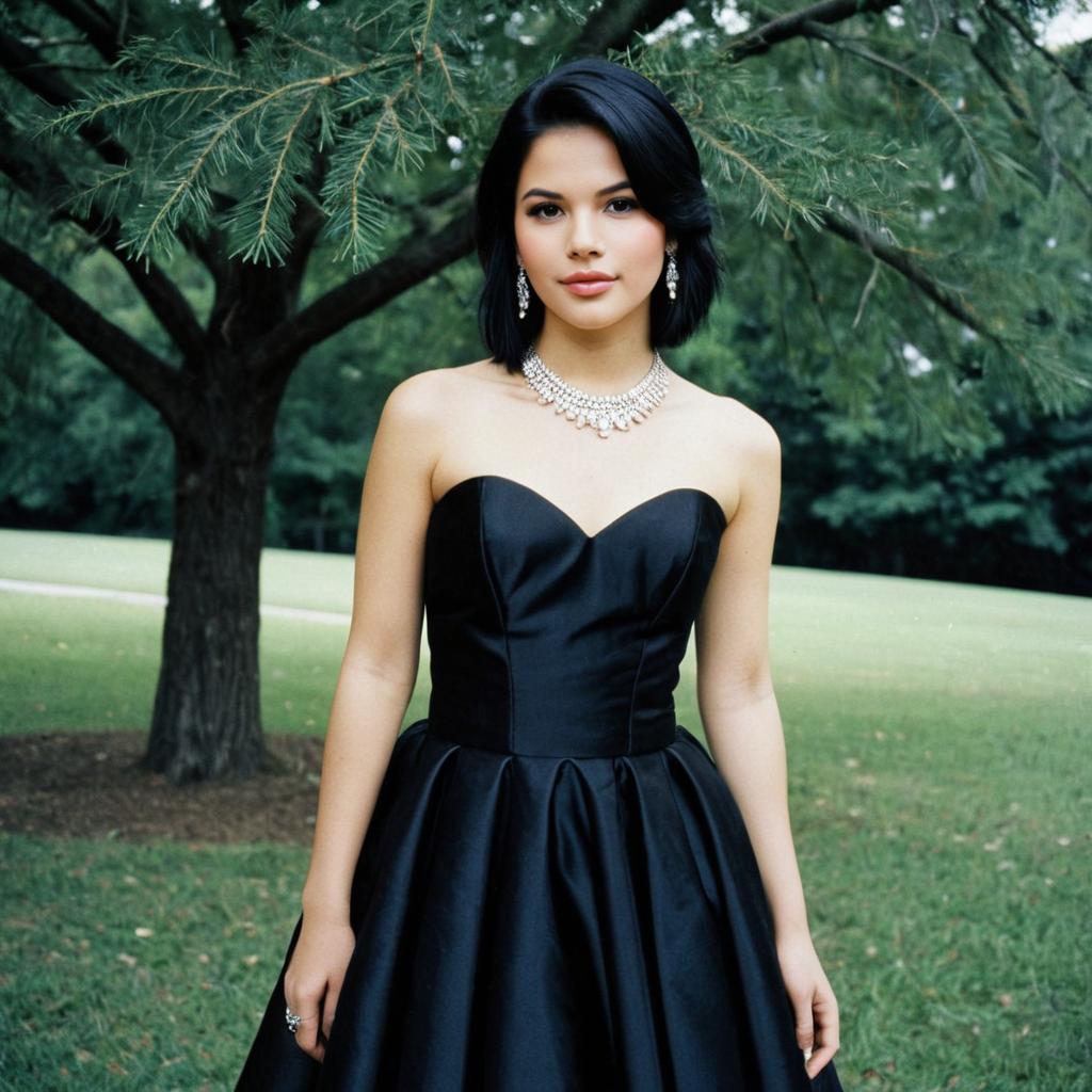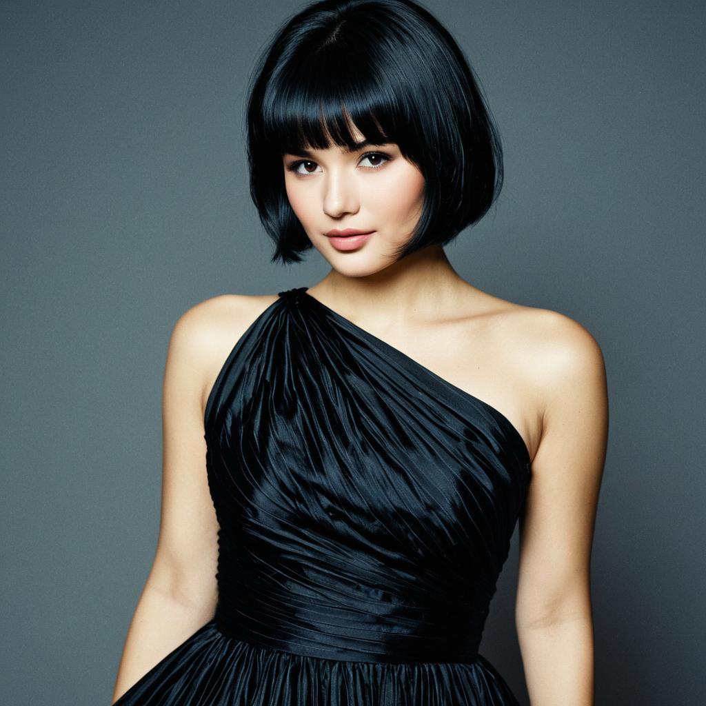 Portrait of an Asian young woman with short black hair wearing a black floral print dress. She is accessorized with pearl earrings and a matching pearl necklace, posed against a coordinating floral background. The image features a realistic style focusing on her upper body and a neutral expression with closed lips.