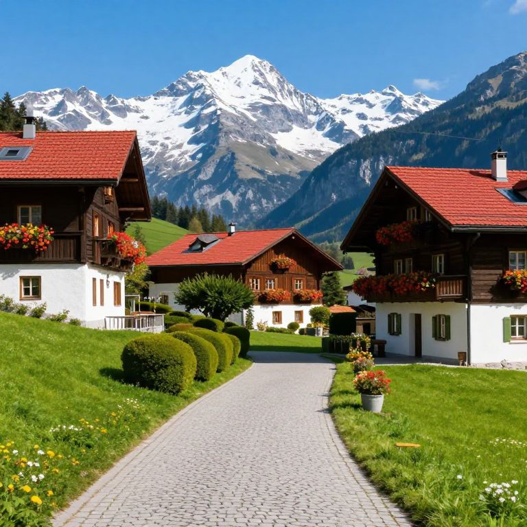 Traditional Alpine chalets with red-tiled roofs and vibrant flower boxes line a winding cobblestone path, surrounded by lush green lawns and manicured hedges, set against the backdrop of majestic snow-capped mountains under a clear blue sky in Mayrhofen.