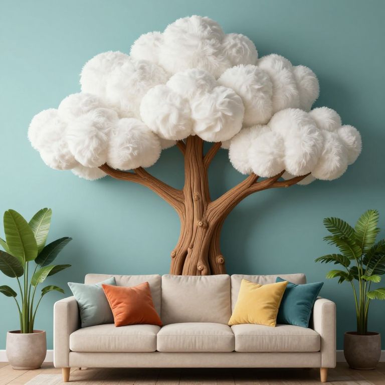 Whimsical tree-like structures crafted from plush white pillows and wooden branches rise majestically above a cozy beige sofa adorned with colorful cushions, flanked by potted plants against a serene teal wall.