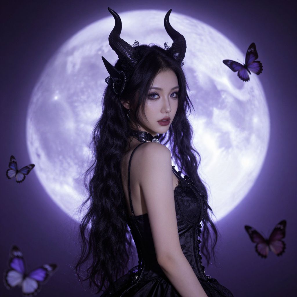 Gothic fantasy woman with long dark hair adorned with devil horns and lace accessories stands gracefully against a radiant purple moon backdrop, surrounded by fluttering butterflies and illuminated by ethereal light.