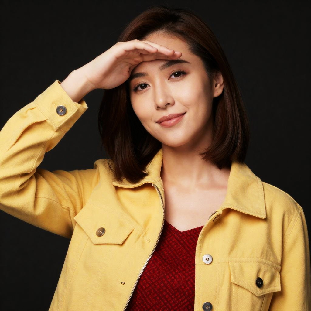 Asian woman with dark hair in a blue track jacket, white turtleneck, sipping a red drink, sitting at a round table. Background has a blurred, colorful painting. She looks to the right with a slight, focused expression. Glass in her right hand, left hand near her mouth. Yellow wall behind her.