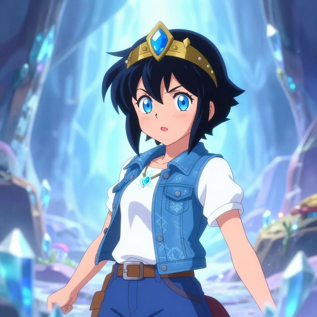 Anime-style illustration of a female adventurer with short black spiky hair and bright blue eyes. She wears a gold tiara with a blue gem, a white shirt under a denim vest adorned with stitched magical glyphs, and blue pants. Blushing with a playful expression, she is depicted within an ethereal, dreamy enchanted crystal cavern. She wears a glowing amulet featuring a blue crystal surrounded by swirling stardust, emphasizing the fantasy theme.