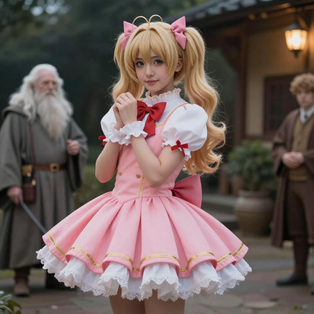 A young woman dressed as a magical girl in a pink dress with white lace and red bows poses at the center. She has long blonde twin tails tied with pink ribbons. In the background, an elderly man resembling Gandalf from Lord of the Rings, wearing a long grey robe and holding a staff, stands on the left. Another man in brown, vintage-style clothing stands on the right. The setting appears to be outdoors near a rustic building, creating a cinematic fantasy scene.