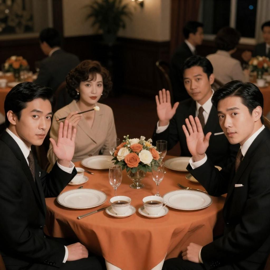 Photograph of six people at a casino poker table. Men in suits, women in elegant dresses. Center man with dark hair, light blue suit. Five women with varied hairstyles, some with jewelry. Green table with gold fringes. Red curtains in background. Poker chips and glasses on table. Women seated, man standing. Formal, vintage setting.