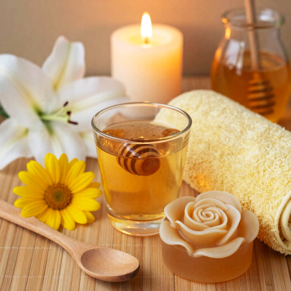 A warm, cozy photograph of a spa setup with a lit candle in the background. In the foreground, there's a glass of honey-colored liquid with a rose-shaped soap, a wooden spoon, a yellow towel, a yellow daisy, white lilies, and a bottle of honey. The soft, orange glow from the candle adds a comforting, relaxing atmosphere.