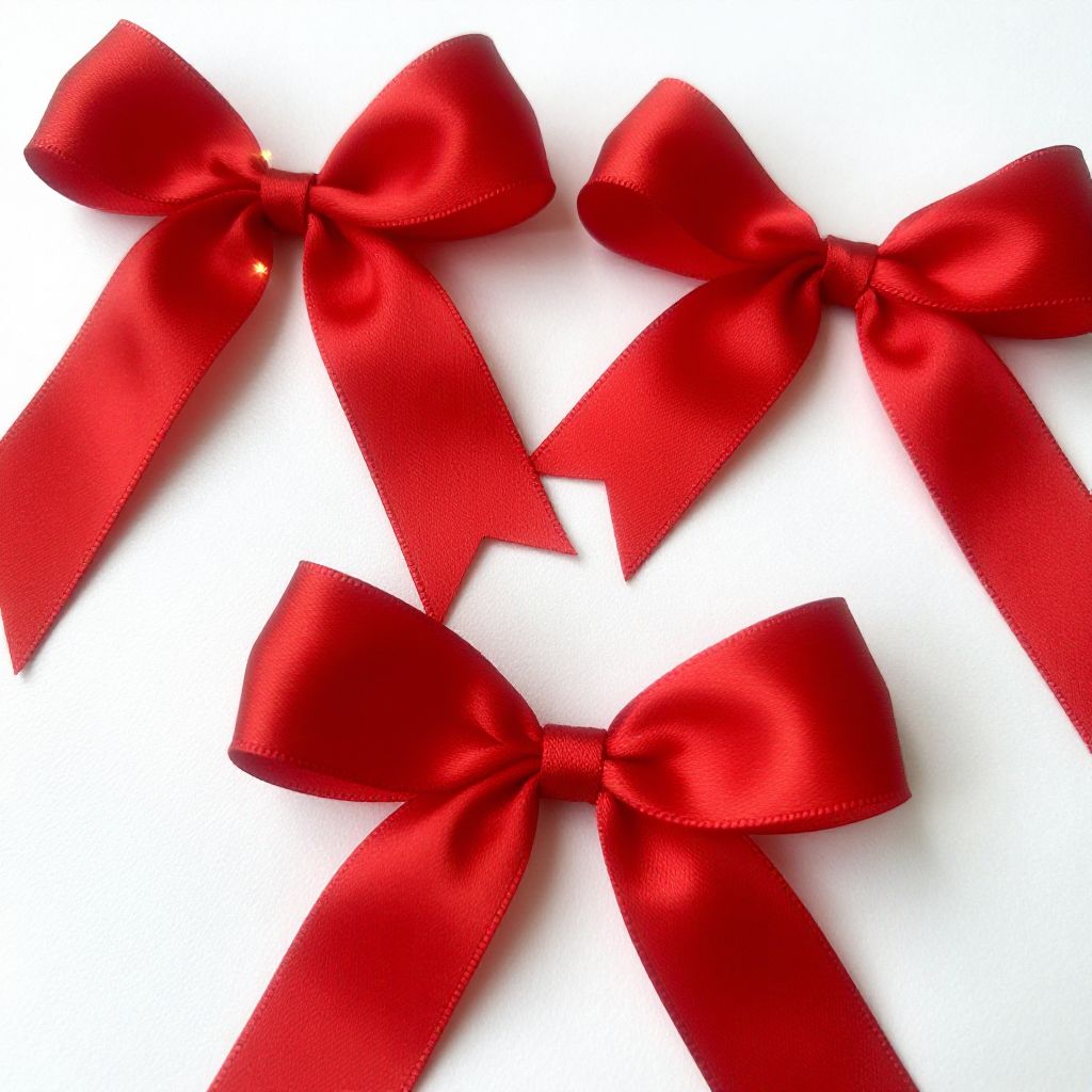 Photograph of four vivid red satin bows arranged diagonally on a white background. Each bow has a smooth, shiny texture with neatly tied loops and long, trailing tails. The bows are evenly spaced, creating a balanced and symmetrical pattern. The bright red color contrasts sharply with the white background, making the bows the focal point of the image. The lighting highlights the glossy finish of the satin material, adding depth and dimension to the bows.