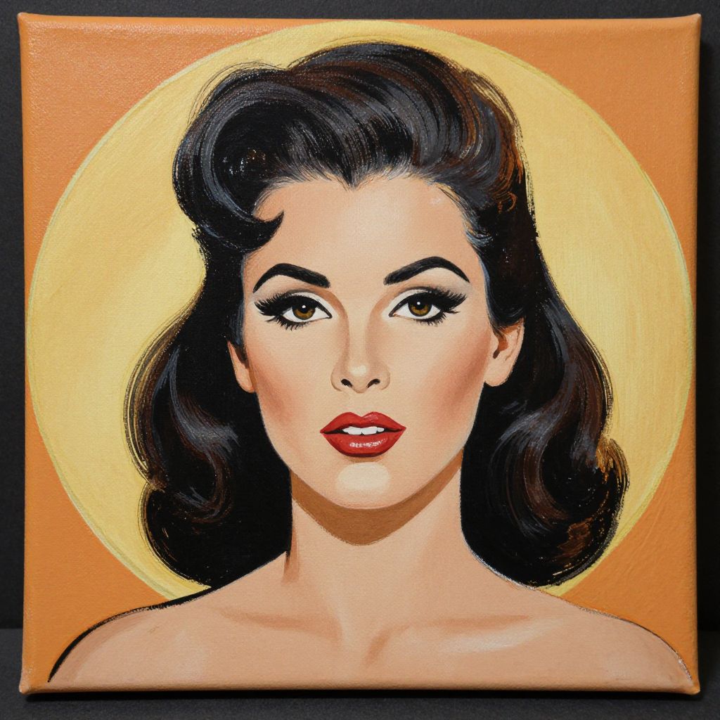 This is a digital pop art portrait of a woman with fair skin, dark wavy hair, and bold red lipstick. Her eyes are large and dark, with thick, arched black eyebrows. She gazes directly at the viewer with a slightly parted red lip. The background is a vibrant orange with a large, glowing yellow halo behind her head, creating a dramatic contrast. The painting has a glossy texture and is framed against a black background. The style is reminiscent of 1950s pin-up art, with strong lines and vivid colors. The woman is depicted from the shoulders up, and there is no visible clothing.