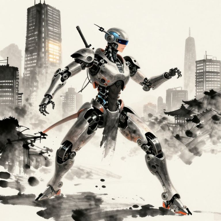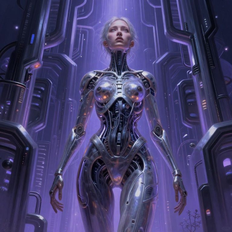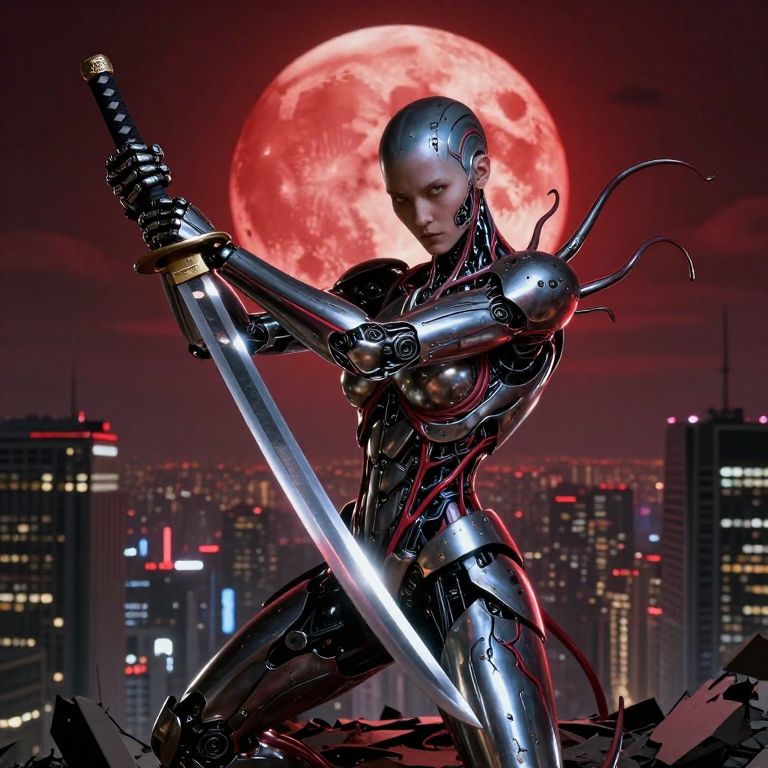 Imagine a hyper-realistic portrait of a cyborg warrior atop a crumbling skyscraper under a crimson moon, gazing down at the sprawling city below with a mix of strength and vulnerability. This figure's metallic body is seamlessly blended with organic tendrils and throbbing veins, embodying both power and menace. In their mechanical grip, they hold a katana that gleams like liquid silver in the stark light, casting dramatic shadows. The image should be rendered with high contrast and vibrant colors, each intricate detail captured to create an awe-inspiring effect that juxtaposes advanced technology's beauty against its looming threat, invoking both wonder and apprehension as viewers contemplate the precarious equilibrium between advancement and annihilation.