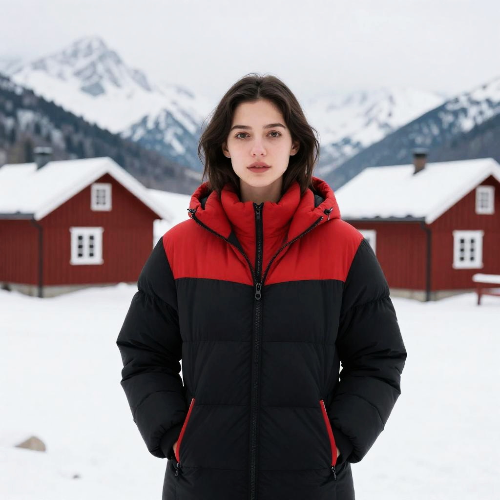 Photograph of a young woman with fair skin and dark brown hair standing in a snowy mountain landscape. She's wearing a black and red puffer jacket with white zipper details and a red hood. Her hands are in her jacket pockets. Behind her, there's a red wooden cabin with snow-covered roofs and majestic, snowy mountains under a bright, overcast sky. She looks directly at the camera with a calm expression.