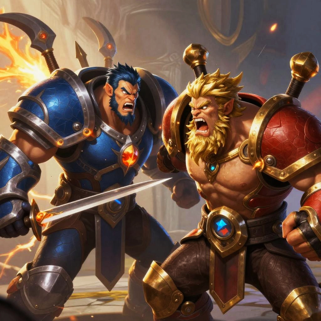 League of Legends inspired image of Urgot vs Garen in a fierce duel, close-up action shot, vivid expressions of rage and determination, futuristic and medieval fusion armor details, lightning and fire effects illuminating the intense fight scene.