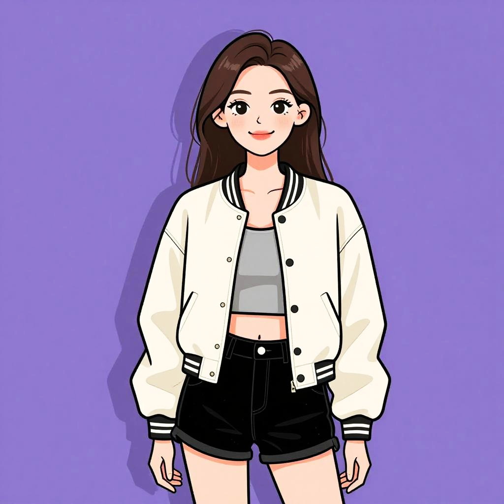 Woman with pretty face and pretty hair. smiling Woman, casual chic, pastel pink textured jacket, wide lapels, drop shoulders, long sleeves, front zipper, side pockets with flaps, visible white lace top underneath, white denim pants, studio gray background --sref 1467