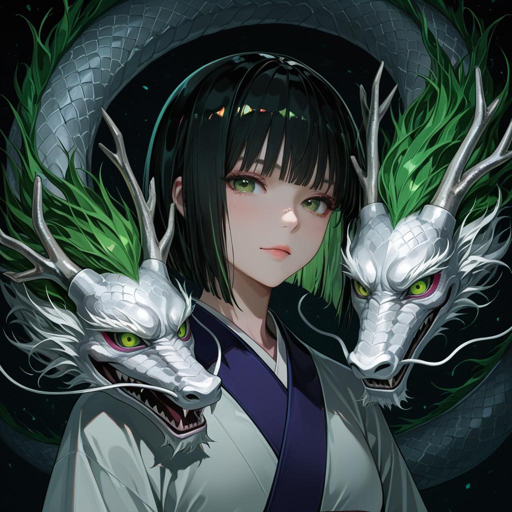 Haku (sen to chihiro no kamikakushi), sen to chihiro no kamikakushi, 1boy, green eyes, short hair, black hair, green hair, bob cut, blunt bangs, japanese clothes, eastern dragon, by artist lam (ramdayo), dark_illustrious