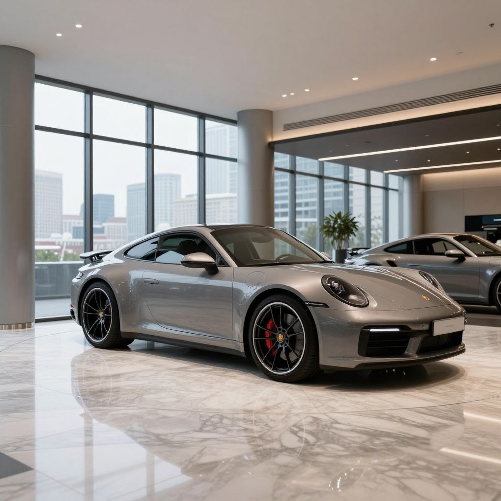 Photograph of a sleek, silver Porsche 911 sports car with black rims and red brake calipers, parked in a modern, well-lit showroom. The car's smooth, glossy finish reflects the large, floor-to-ceiling windows in the background, which reveal a cityscape with tall buildings. The showroom features a polished white marble floor and is adorned with minimalist decor, including a small potted plant to the right. Another silver car is partially visible in the background. The lighting is bright, highlighting the car's curves and the showroom's contemporary design.