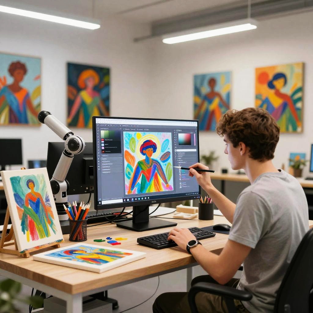 AI art sites concept visual with a seamless blend of human creativity and artificial intelligence, displaying a virtual artist studio filled with holographic canvases, robotic arms painting, and digital brushes producing vibrant colorful masterpieces.