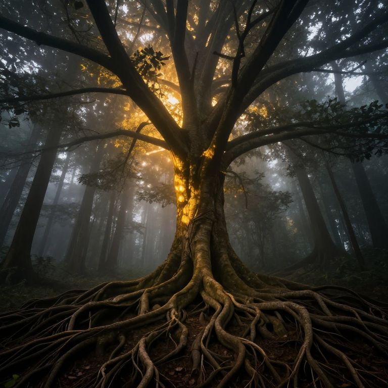 Majestic roots sprawl outward from a central tree illuminated by golden starlight, casting a mystical glow amidst a dense forest of silhouetted trunks and branches shrouded in ethereal mist.