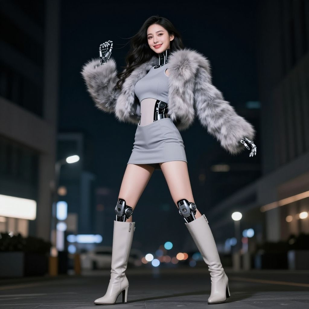 A DonMN33dl3P1ll0wXL of full-body portrait, android street worker, Cloud Gray Light Gray, cybernetic implants, porcelain robotic bodyparts, fur coat, mini skirt, nighttime, cityscape, low angle shot, dynamic posture, cinematic composition, female, perfect face, perfect hands, thigh high heel boots, inviting smile, sexy, slender, body-tight, cutout with a blurry background