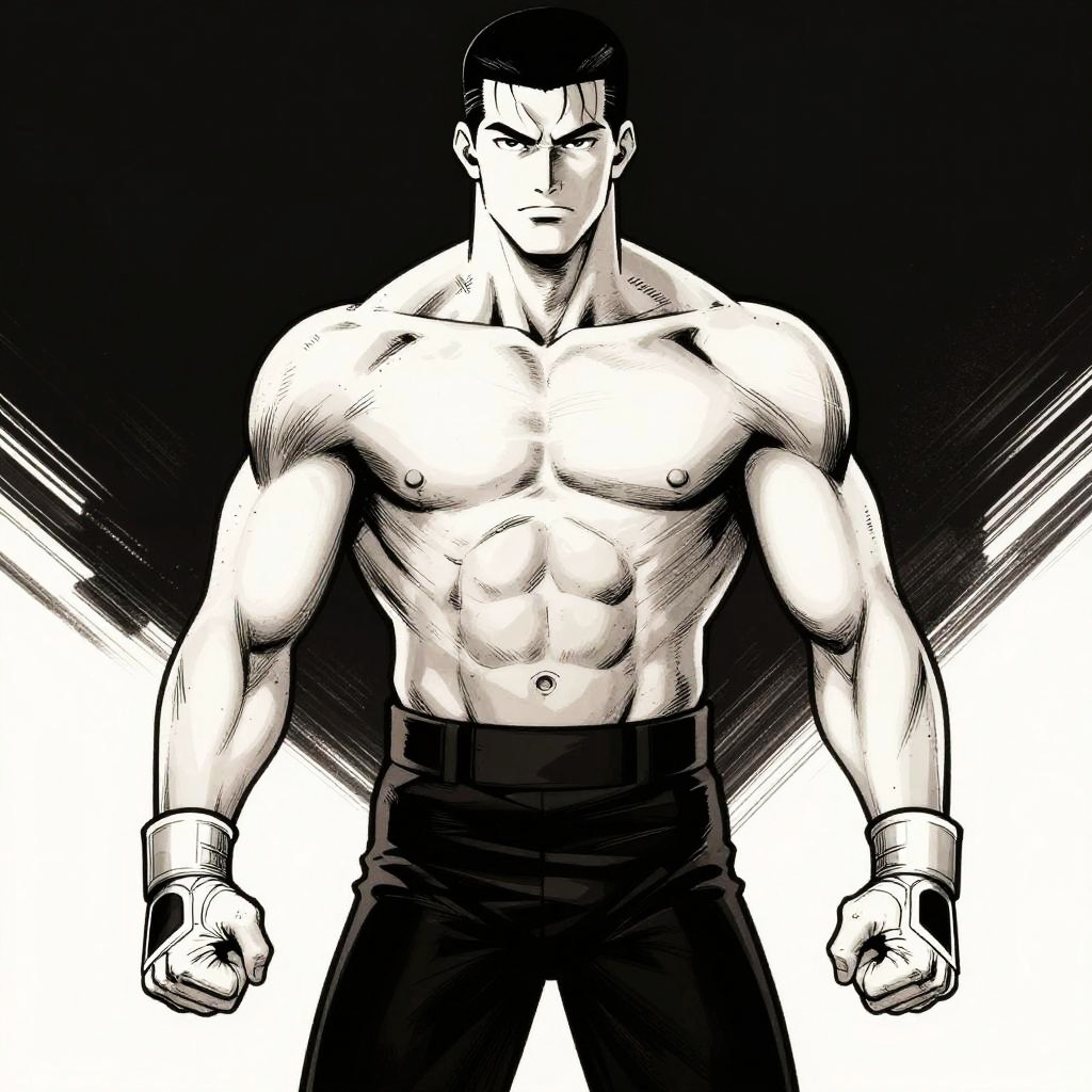 (best quality, comics style, artwork, lineart:1.4), a fighters, short hair, black pants, white shirt, bold contours, bold outlines, cinematic