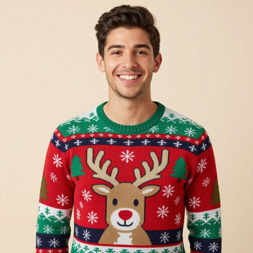 Photograph of a smiling young man with short, dark brown hair and light stubble. He's wearing a festive Christmas sweater with a large, beige reindeer graphic in the center, surrounded by green pine trees and white snowflakes on a red background. The sweater has green, red, and navy blue horizontal stripes with white patterns. The background is a plain, light beige.