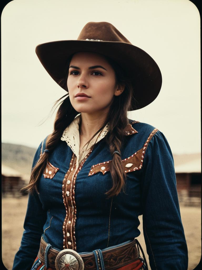 Woman in Cowgirl Costume, cinematic realism, strong western portrait