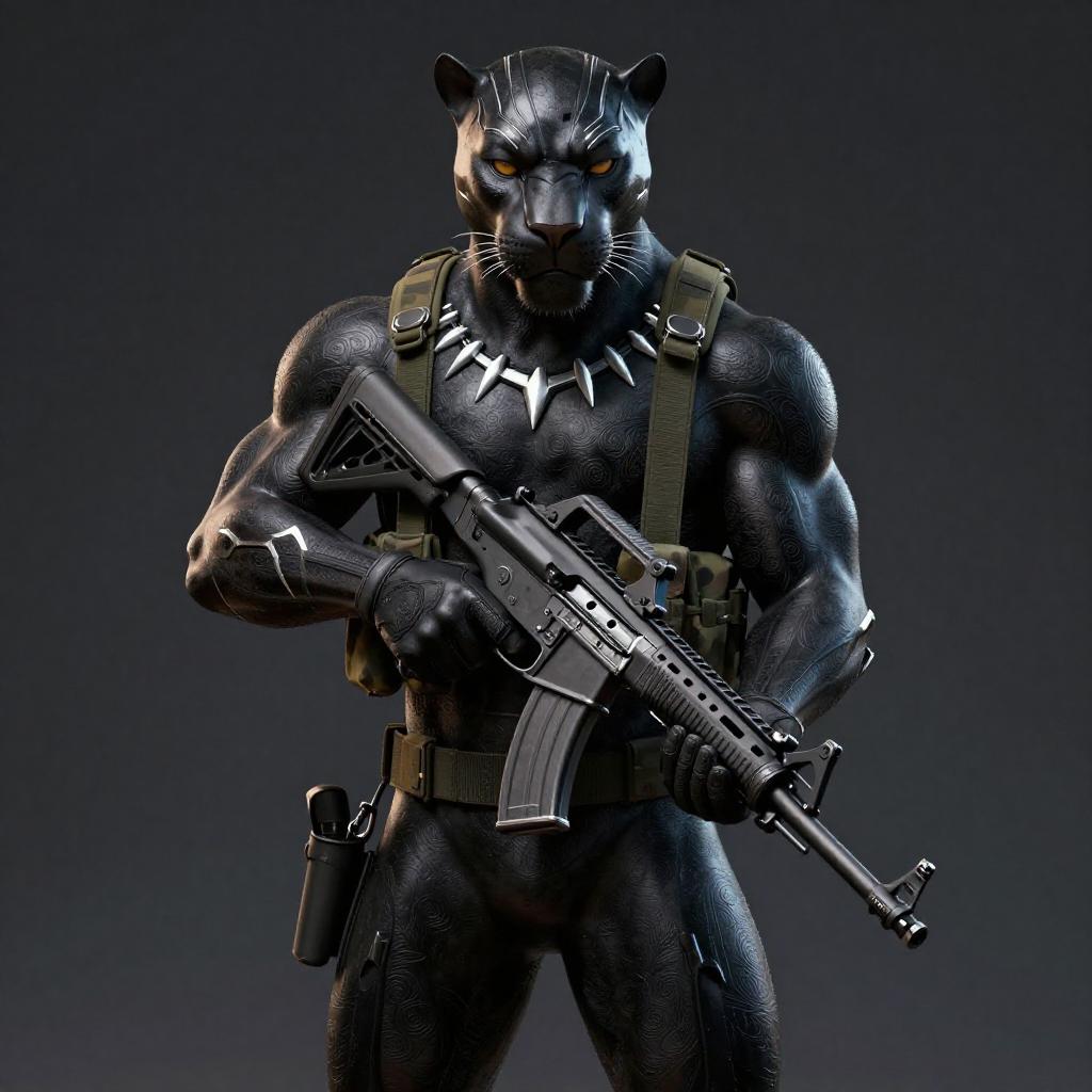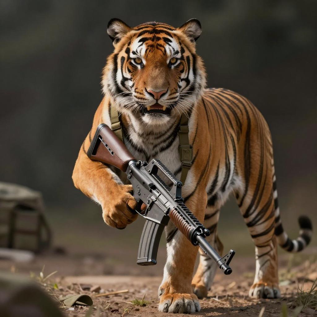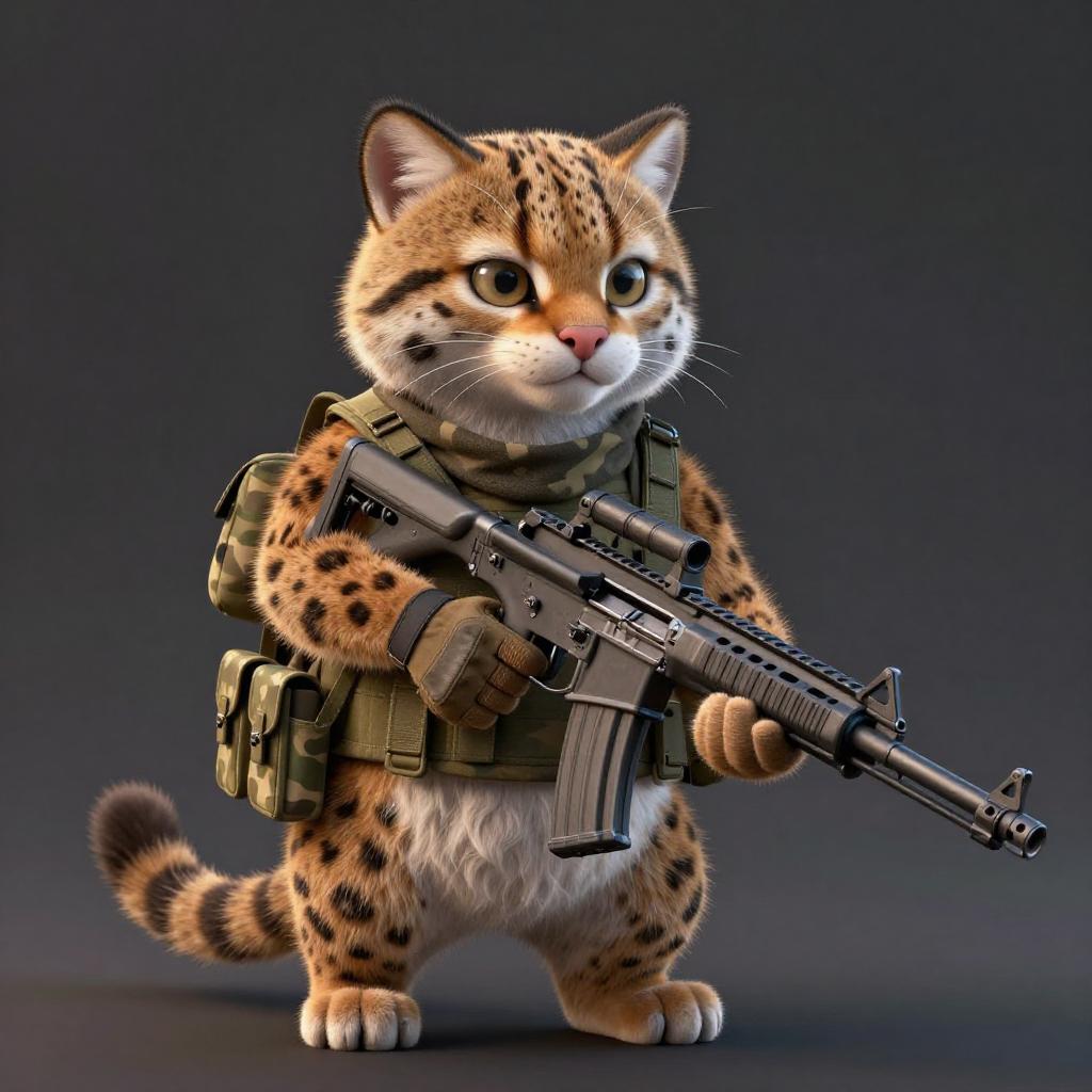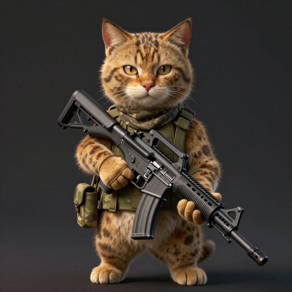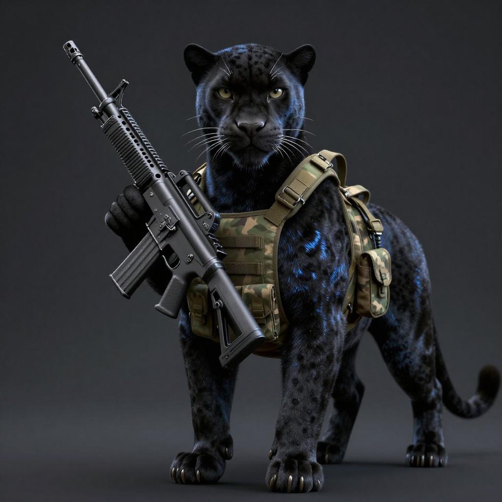 Absurdres, (realistic:1.5), (masterpiece, Extremely detailed CG unity 8k wallpaper, best quality, highres:1.2), (ultra_detailed, UHD:1.2), perfect illumination, unreal engine, sidelighting, (dark background:1.4), (mountain lion:1.2), (sable-brown mountain lion mountain lion:1.2), (golden-tawny flanks with creamy-throat patch mountain lion:1.2), (no humans:1.2), (furry:1.1), animal focus, animal, solo, standing, weapon, gun, rifle, assault rifle, gloves, holding, holding weapon, holding gun, military, whiskers, load bearing vest, pouch, holster, camouflage, bag, scarf, blurry background