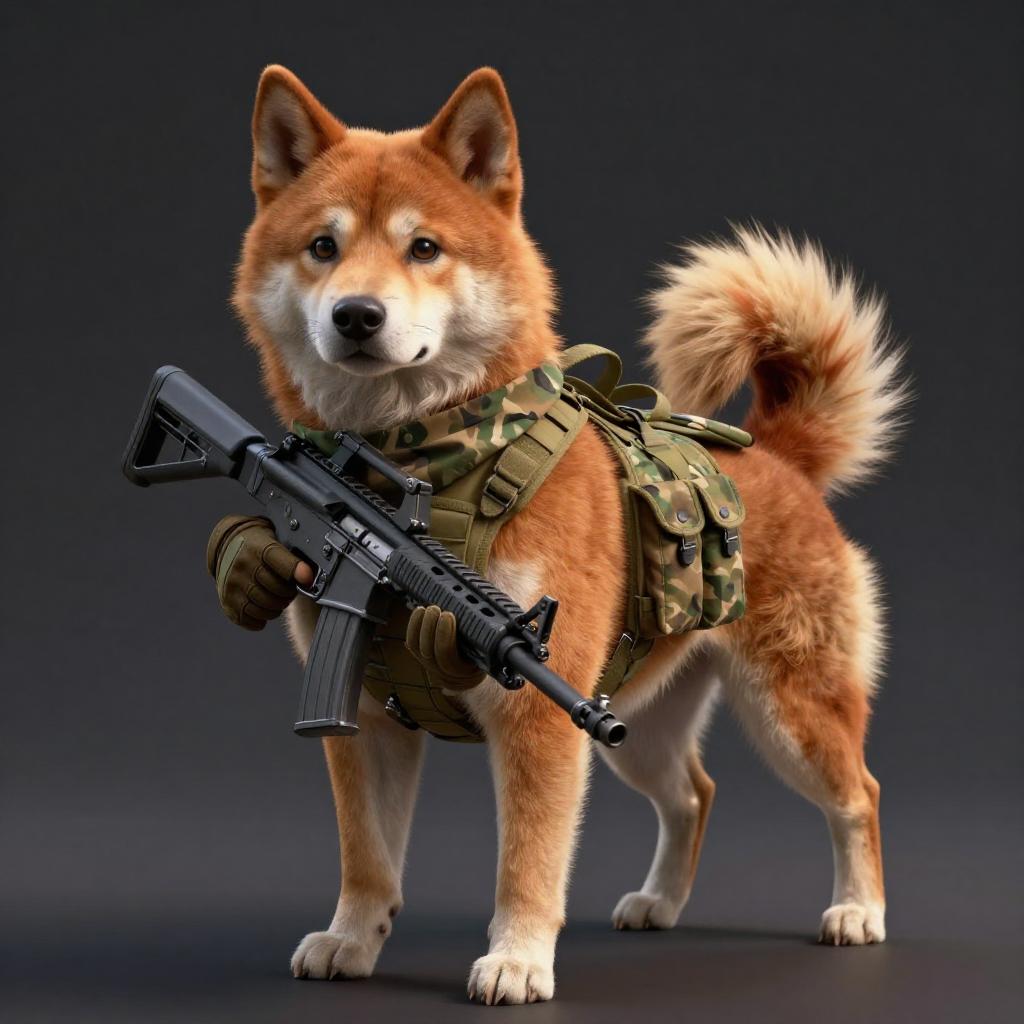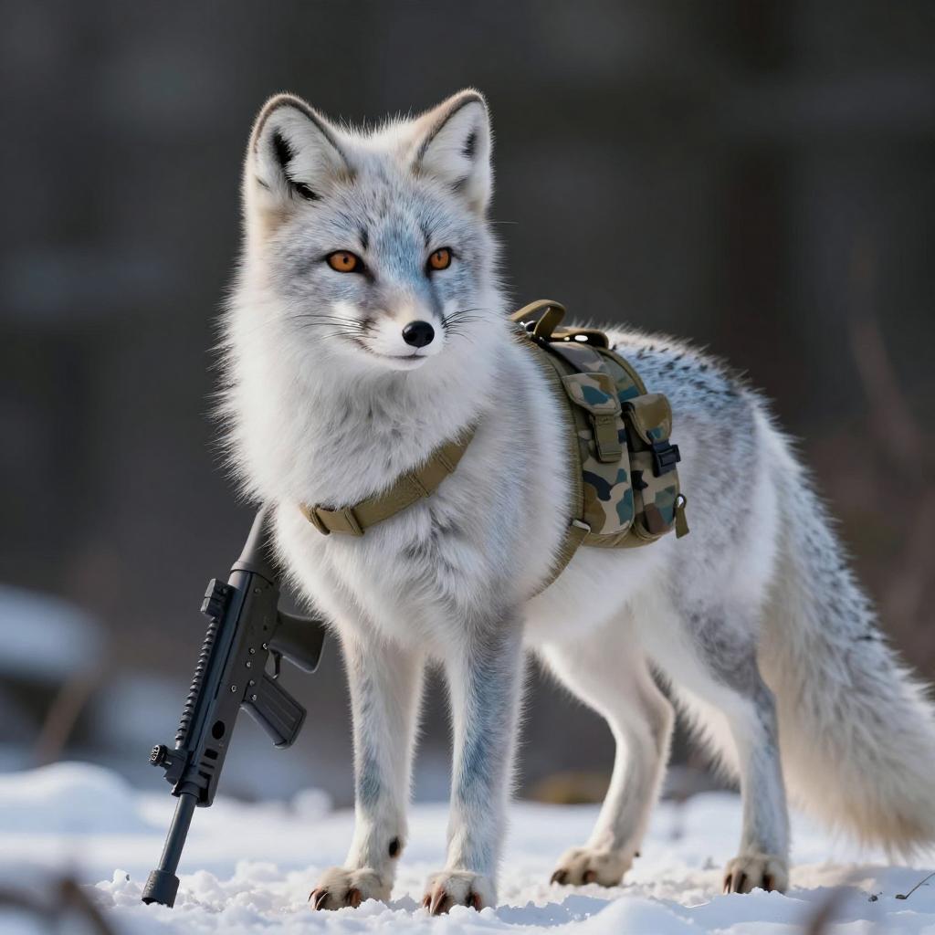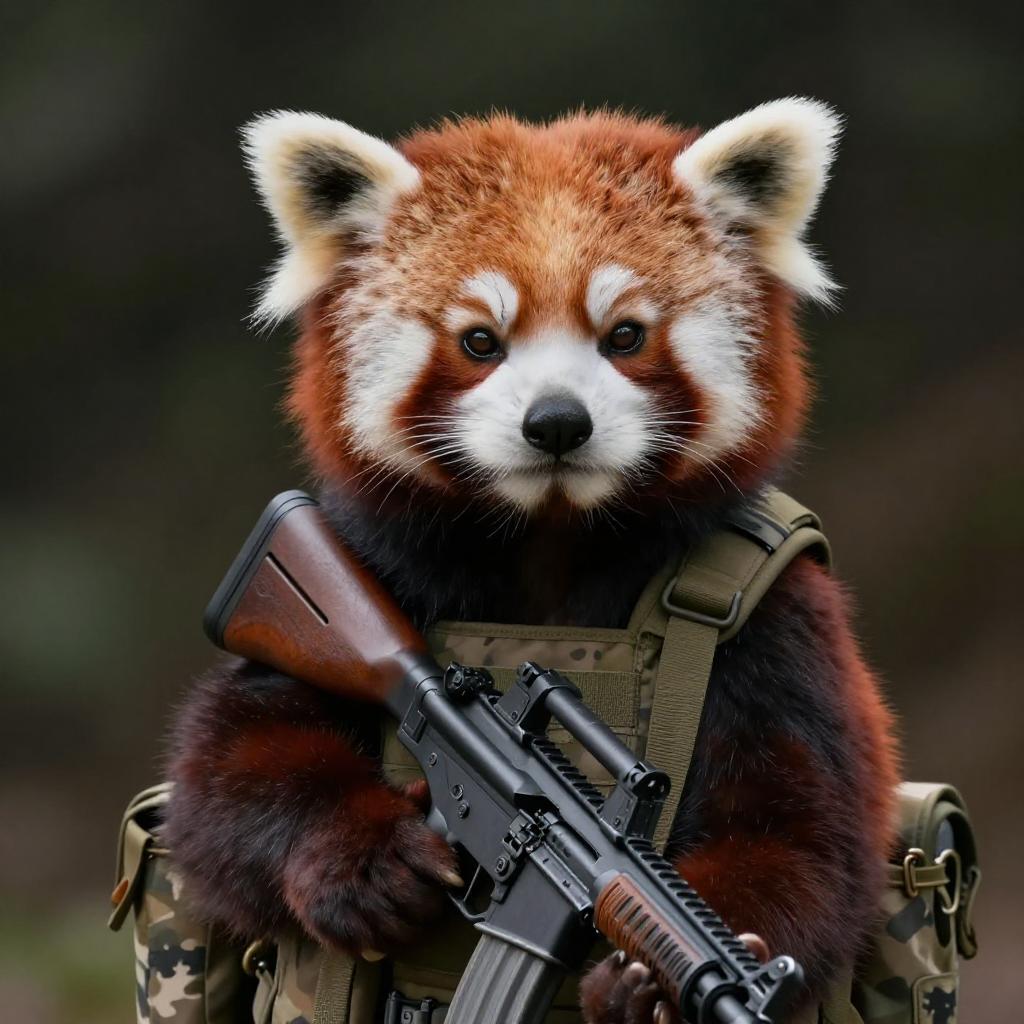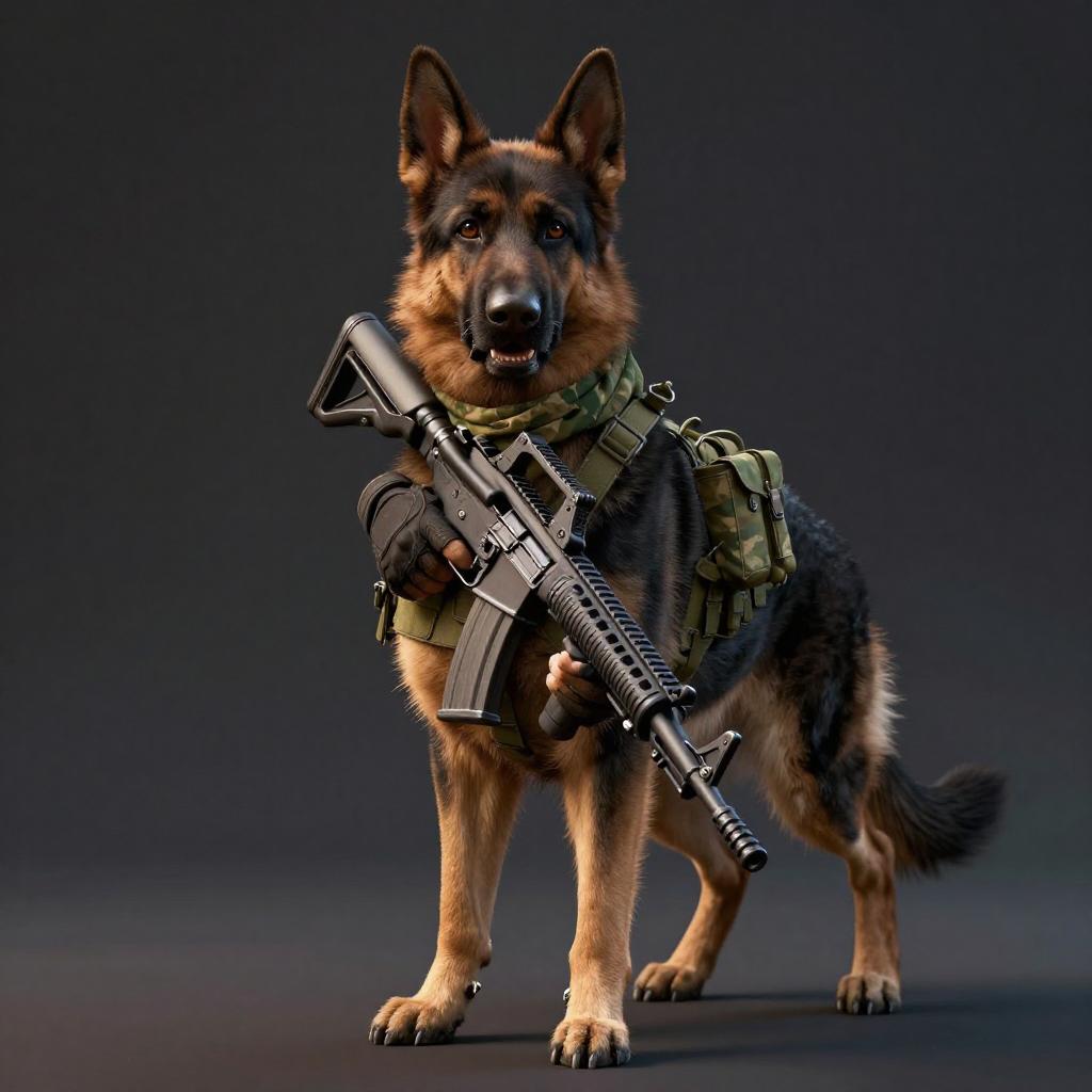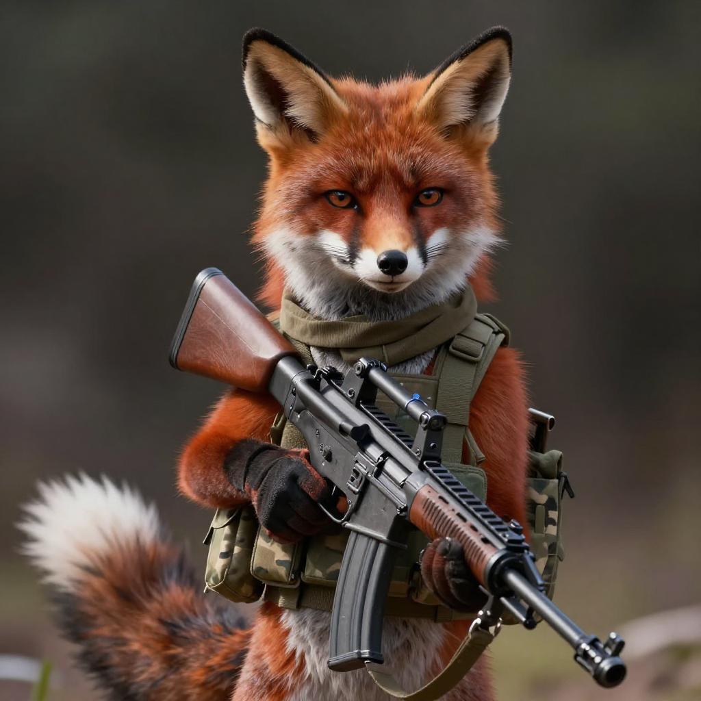 Absurdres, (realistic:1.5), (masterpiece, Extremely detailed CG unity 8k wallpaper, best quality, highres:1.2), (ultra_detailed, UHD:1.2), perfect illumination, unreal engine, sidelighting, (dark background:1.4), (mountain lion:1.2), (sable-brown mountain lion mountain lion:1.2), (golden-tawny flanks with creamy-throat patch mountain lion:1.2), (no humans:1.2), (furry:1.1), animal focus, animal, solo, standing, weapon, gun, rifle, assault rifle, gloves, holding, holding weapon, holding gun, military, whiskers, load bearing vest, pouch, holster, camouflage, bag, scarf, blurry background