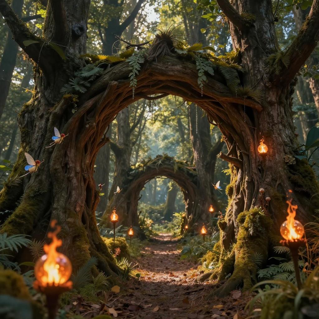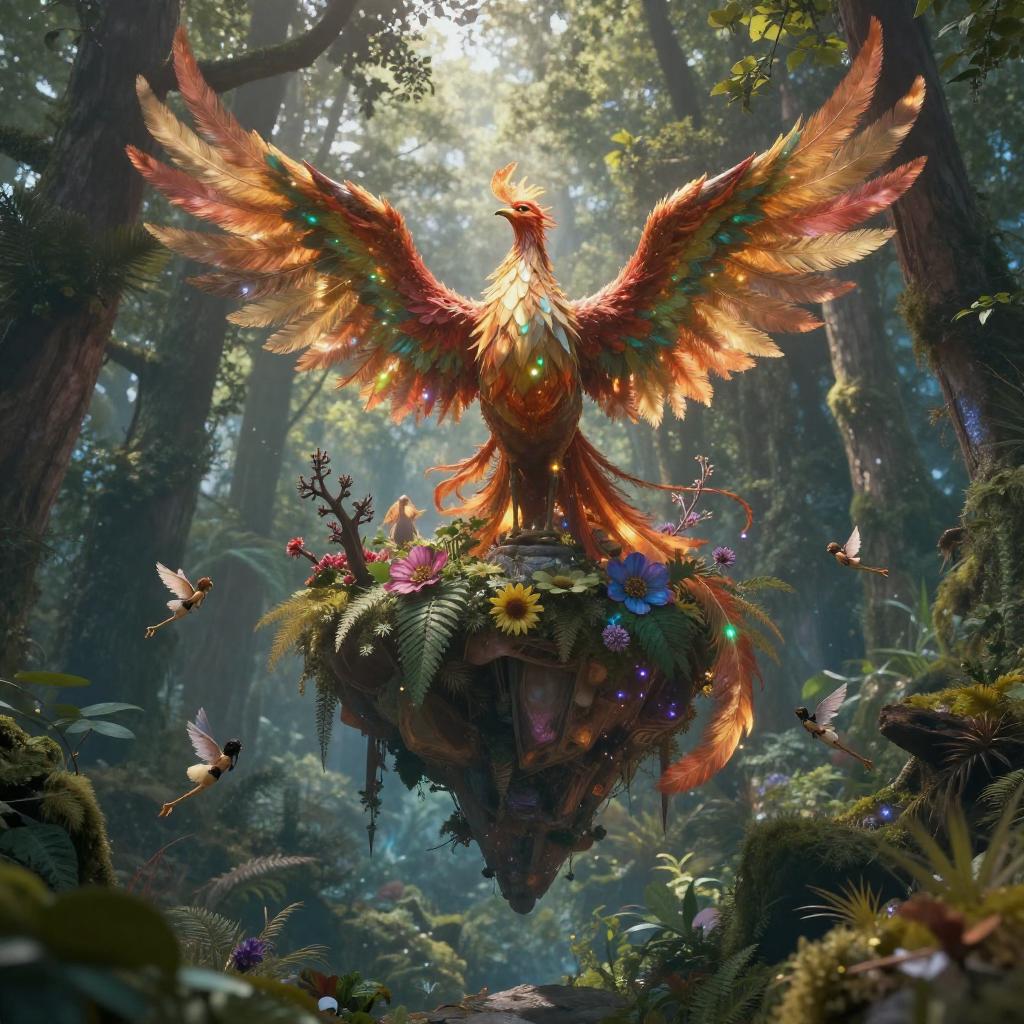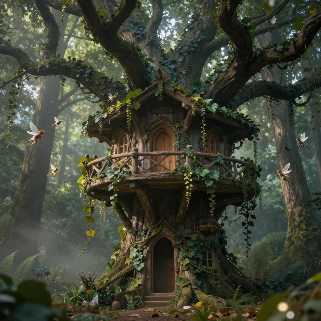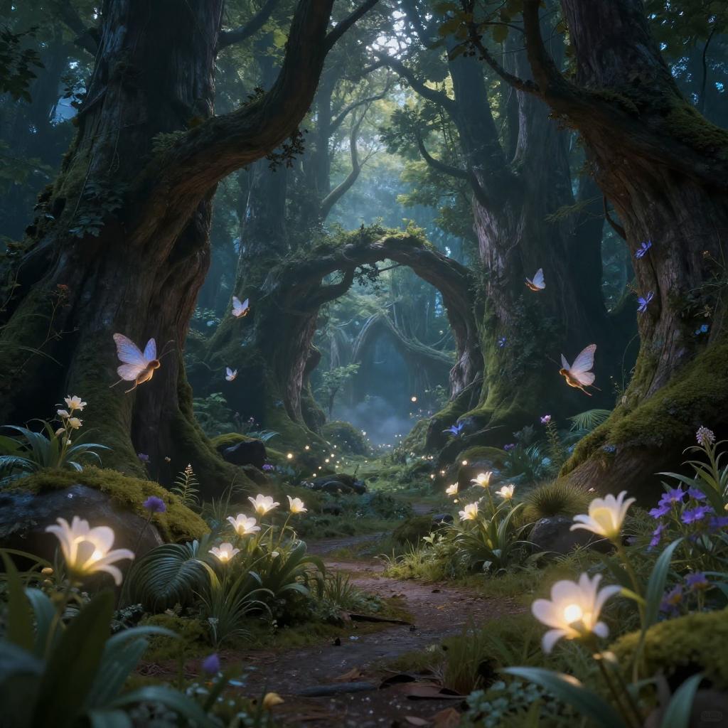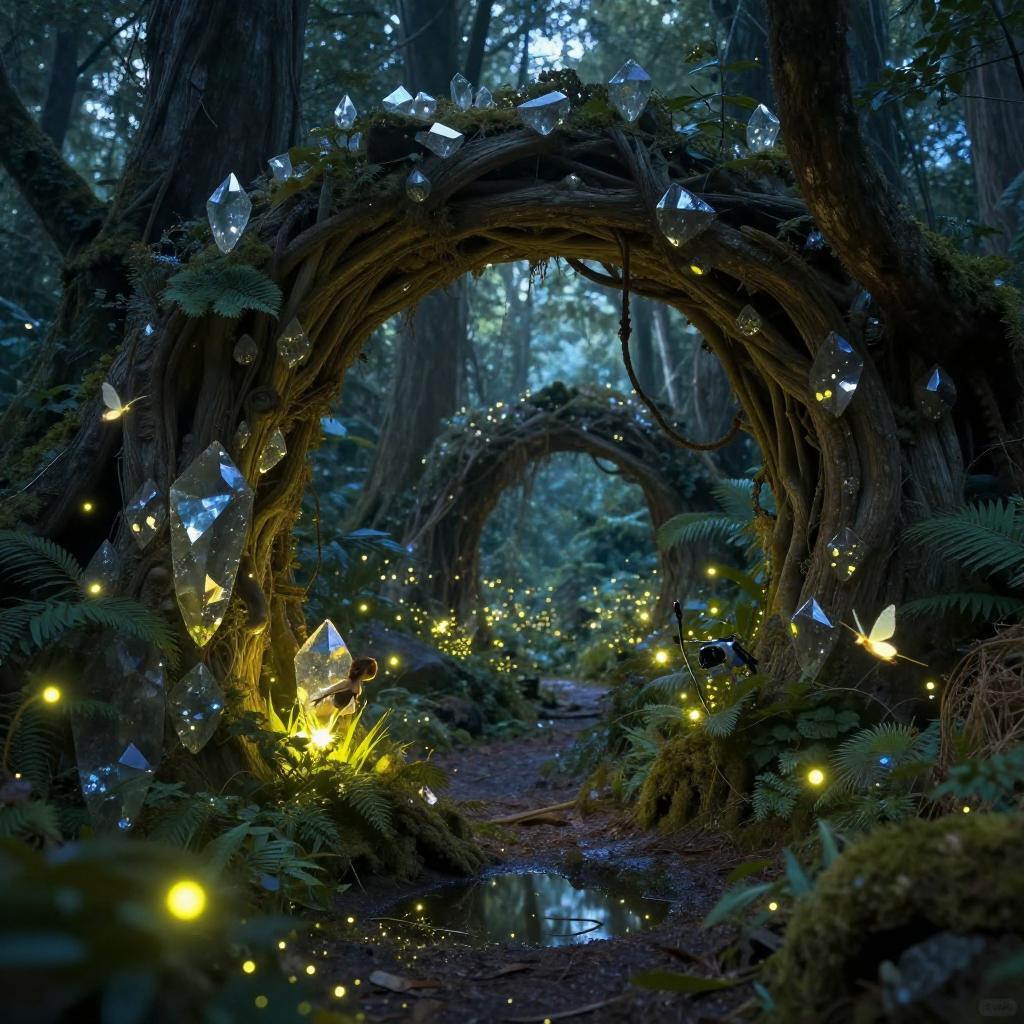 A highly detailed photorealistic image of a crystal grotto hidden deep within an enchanted forest, with twinkling fireflies and fairies fluttering about, Type of Image: Fantasy scene, Art Styles: Whimsical, Tolkien inspired, Art Inspirations: John Howe, Alan Lee, Renderings: glowing reflections, Camera: 35mm lens, Establishing shot