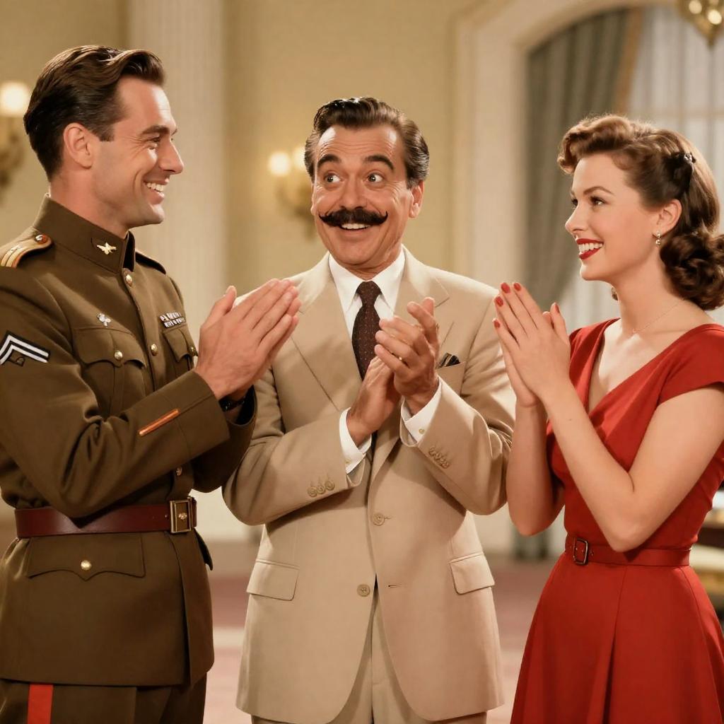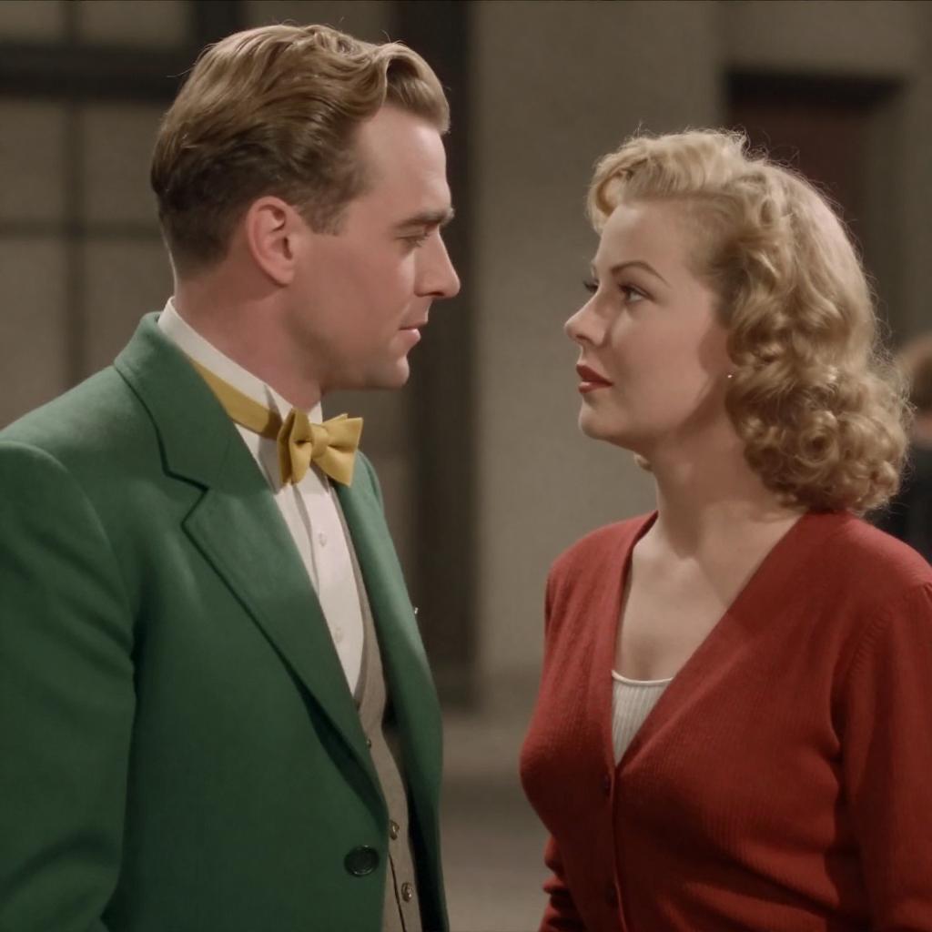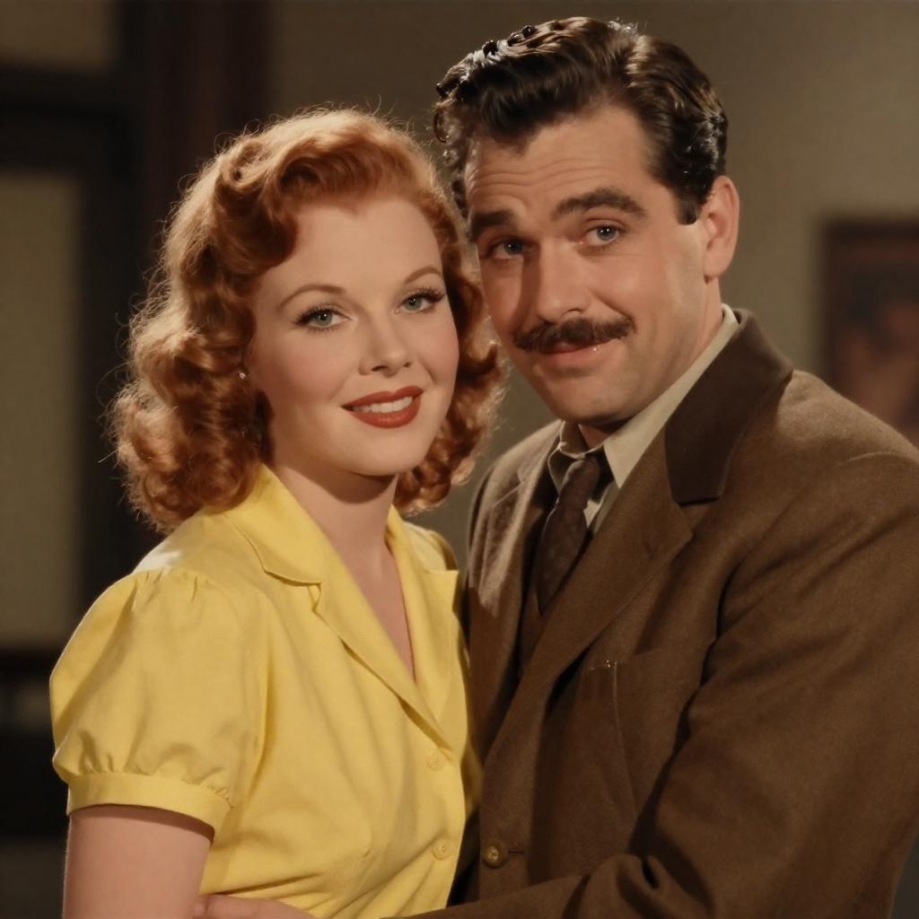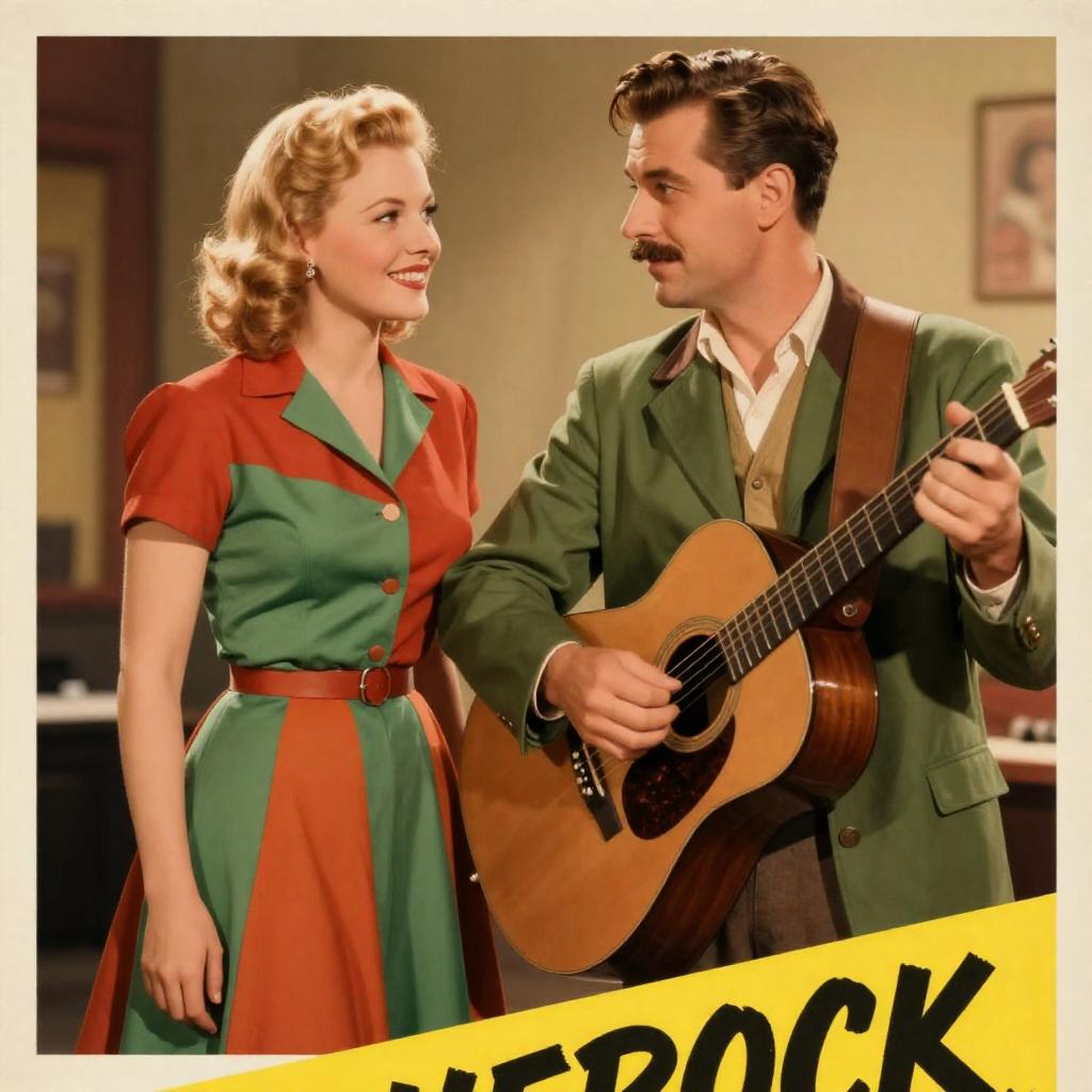 Photograph of a 1940s-style movie poster. A smiling woman with blonde hair in a red, green, and orange dress stands beside a man with short brown hair, a mustache, and a green jacket, playing an acoustic guitar. Both look at each other. A yellow movie poster is in the bottom right corner.