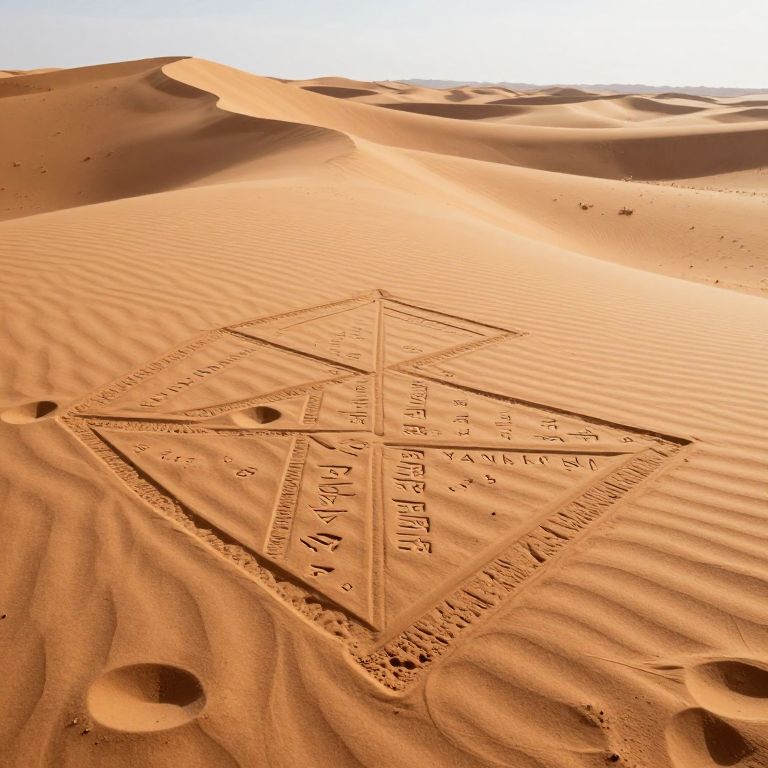 Photograph of a sunlit desert with a large, etched geometric triangle in the sand, surrounded by ripples and small holes.