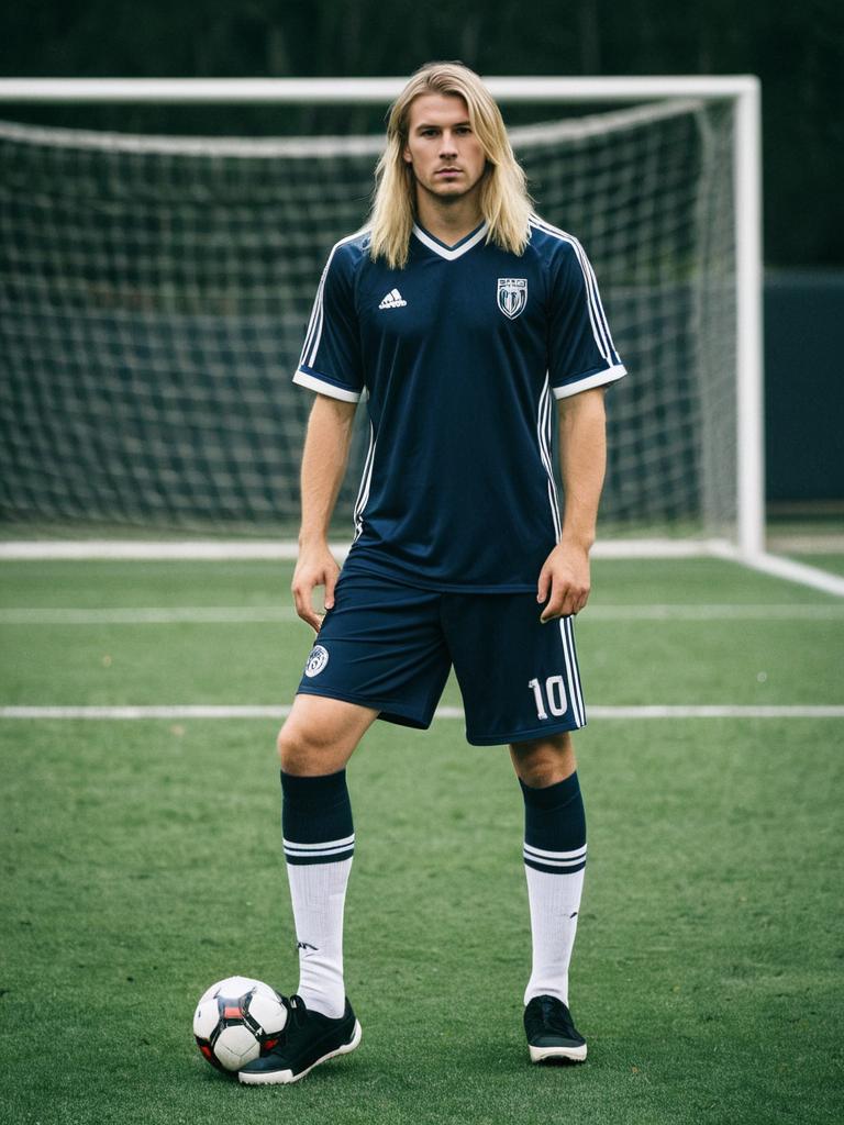 Full-body portrait of a male soccer player with long blonde hair wearing a navy blue soccer uniform with white trimmed sleeves and stripes, white socks, and black sneakers. The player stands on a soccer field with one foot resting on a soccer ball, positioned in front of a goal net. The uniform features the number 10 and a team logo. The image captures a focused sportswear look, suitable for soccer or football.