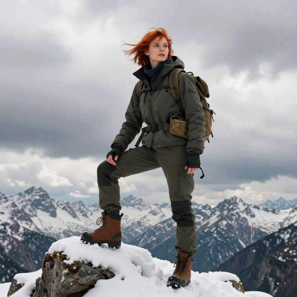 Darrin standing on a rugged mountain peak during a dramatic storm, wind whipping through his clothes, dark clouds and lightning illuminating the scene, symbolizing resilience and strength, rendered with dynamic brush strokes in a dramatic realism style.