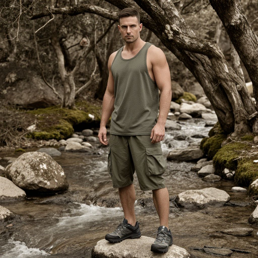 Photograph of a muscular, light-skinned man with short brown hair standing in a forest stream. He wears a dark green tank top, matching cargo shorts, and black hiking shoes. His arms are slightly flexed, highlighting his biceps. The background features moss-covered rocks, flowing water, and twisted, leafless trees. The forest is dense with dark, textured bark and earthy tones. The man's serious expression and confident stance suggest a sense of strength and determination. The lighting is natural, highlighting the textures of his clothing and the surrounding environment.