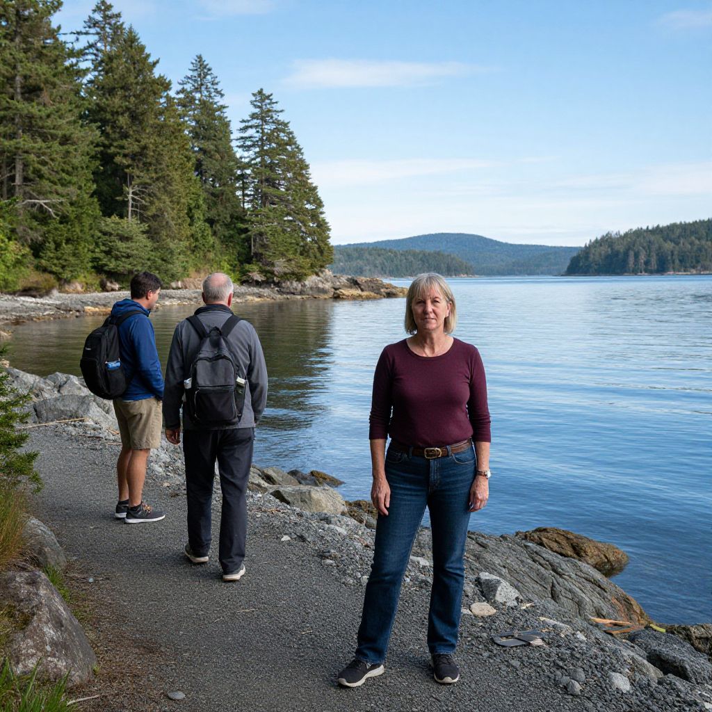 Photograph of a serene lakeside scene featuring three people. In the foreground, a middle-aged woman with short gray hair, wearing a maroon long-sleeve shirt and blue jeans, stands smiling on a rocky shore. To the left, two men, one bald and the other with short brown hair, both wearing backpacks and casual hiking clothes, walk away from the camera towards the lake. The lake is calm with clear blue water, surrounded by dense evergreen trees. The sky is clear with a light blue hue, and distant forested hills are visible on the horizon. The rocky shore has scattered rocks and small patches of grass.