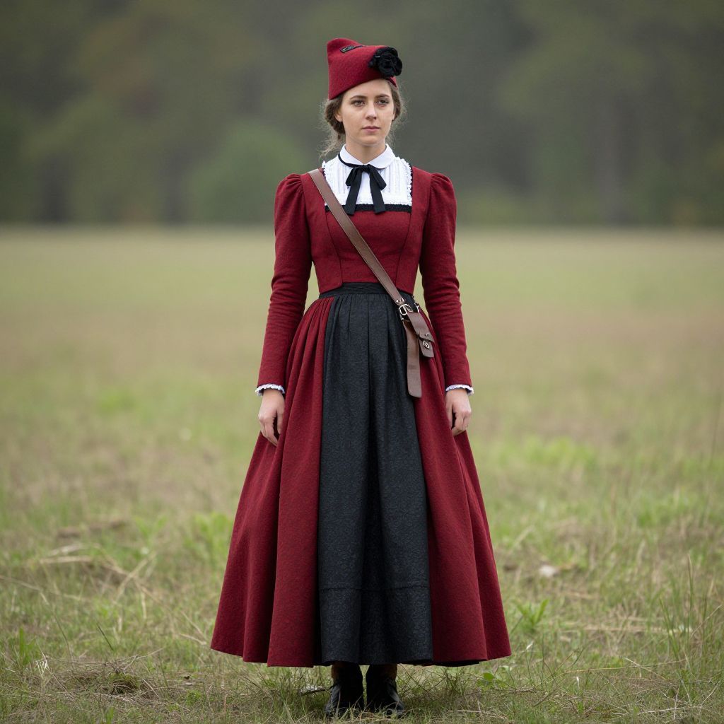 Woman Civil War Costume, woman in a red and black dress with a red hat