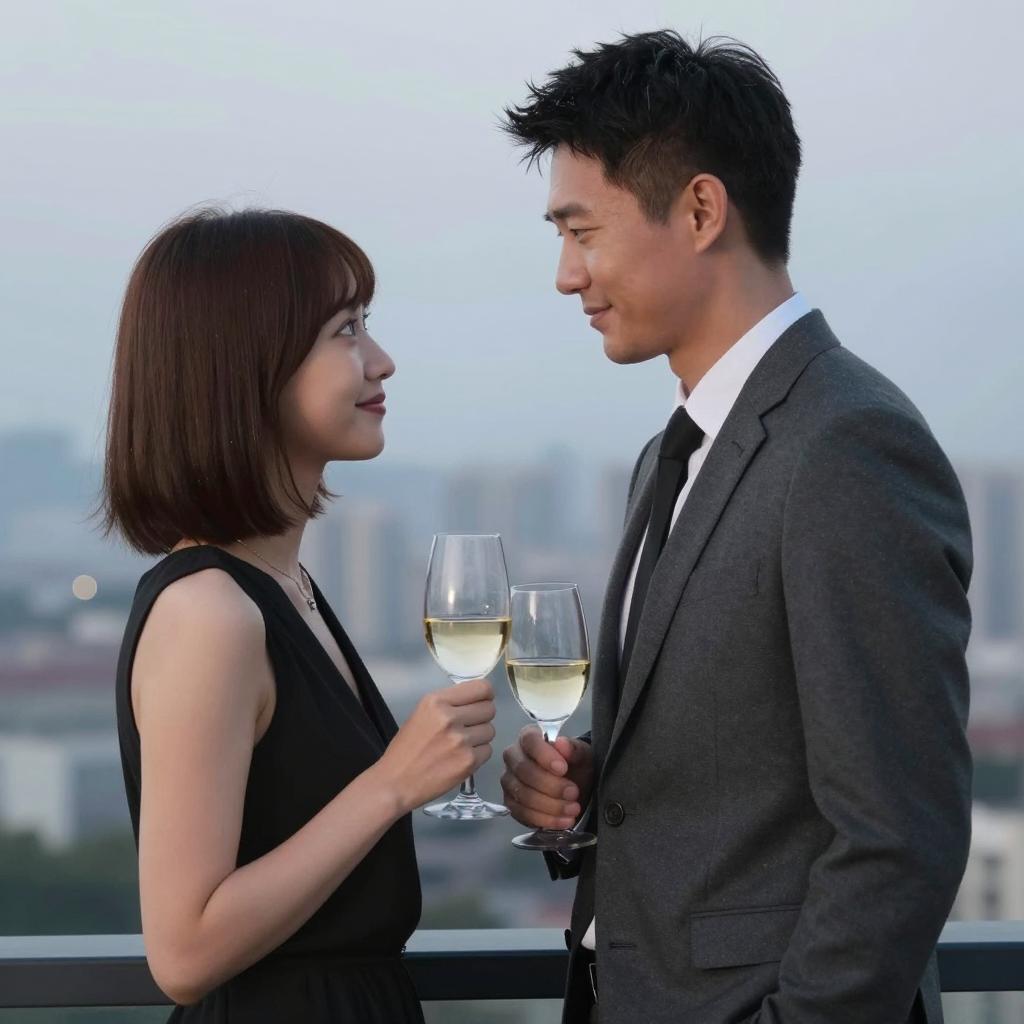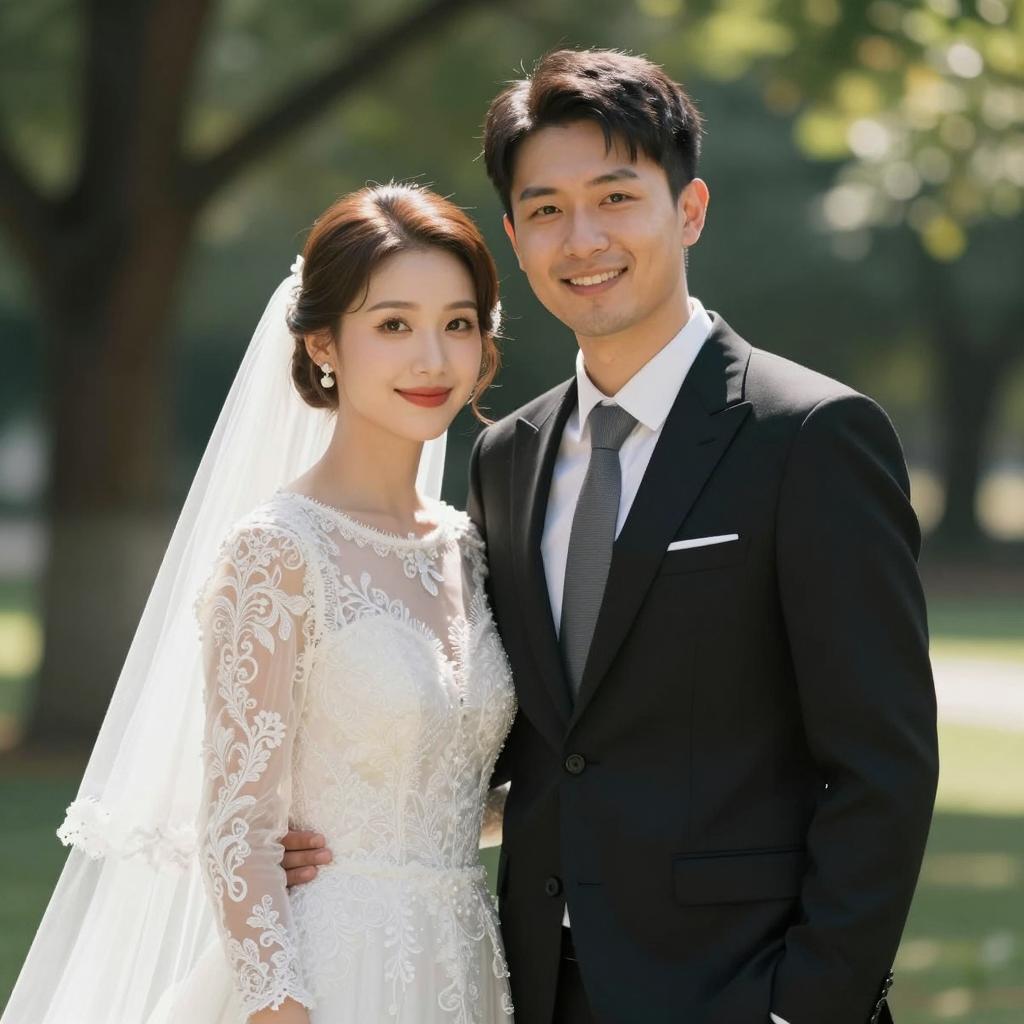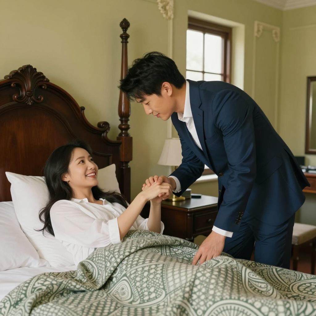 Asian man in a blue suit and white shirt bends over a bed holding hands with a smiling Asian woman lying in bed. The woman has long black hair, wears a white blouse, and is covered with a green patterned blanket. The bed has white sheets and an ornate dark wooden headboard. The room features yellow-green walls, a window with natural light, decorative molding, and wooden furniture including a nightstand and a desk with a mirror.