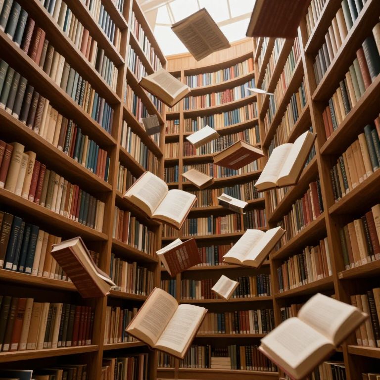 Photograph of a library with tall wooden bookshelves filled with books of various colors and sizes, arranged in neat rows. Several open books of different sizes are suspended mid-air, floating in a seemingly magical manner. The shelves curve inward toward the ceiling, creating a tunnel-like effect. The lighting is bright, highlighting the books and shelves while casting soft shadows. The overall atmosphere is whimsical and enchanting, suggesting a fantasy or magical realism style.
