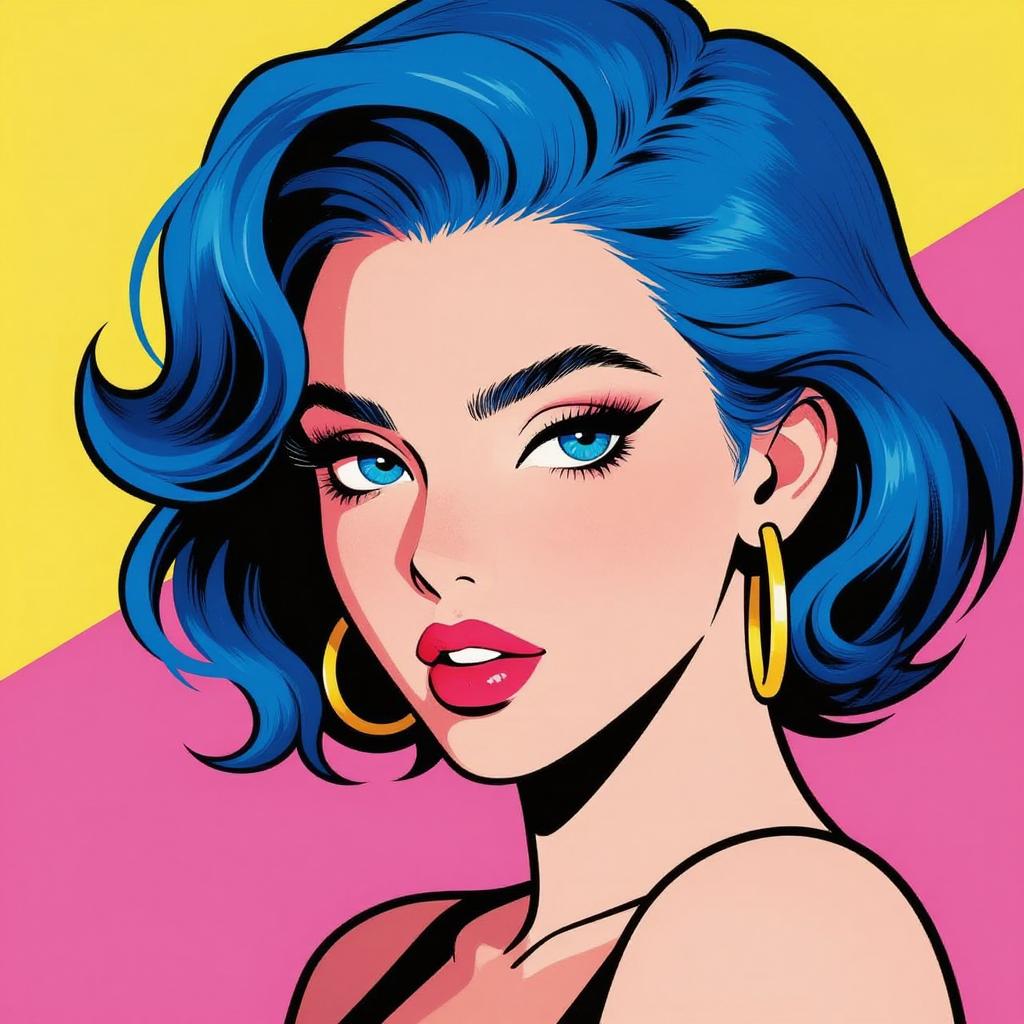 This vibrant illustration features a stylish woman with striking blue hair, exuding confidence and charm. The artwork employs bold colors and smooth lines, characteristic of pop art styles, capturing a playful yet captivating essence. The composition is dynamic, drawing attention to the character's expressive features and the vivid background.