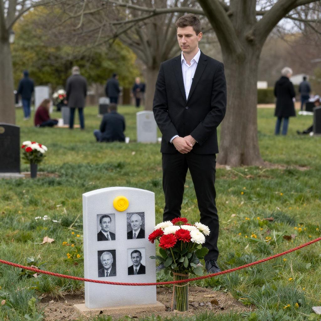 Photograph of a man in a black suit and white shirt standing beside a grave in a park. The grave has a white headstone with black-and-white photos, a yellow circular ornament, and red and white flowers. A red rope barrier surrounds the grave. Background includes trees and people sitting on the grass.