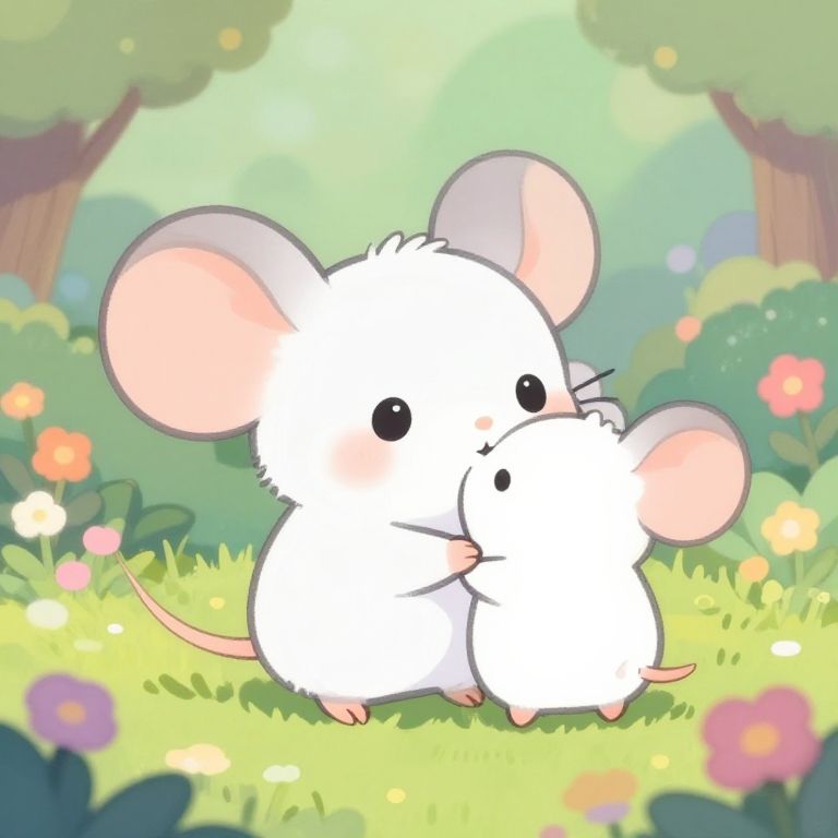 Digital cartoon-style illustration of two adorable white baby mice with large ears and pink tails embracing in a colorful enchanted garden filled with flowers and greenery. The scene has a dreamy, kawaii aesthetic with soft lighting and pastel colors.