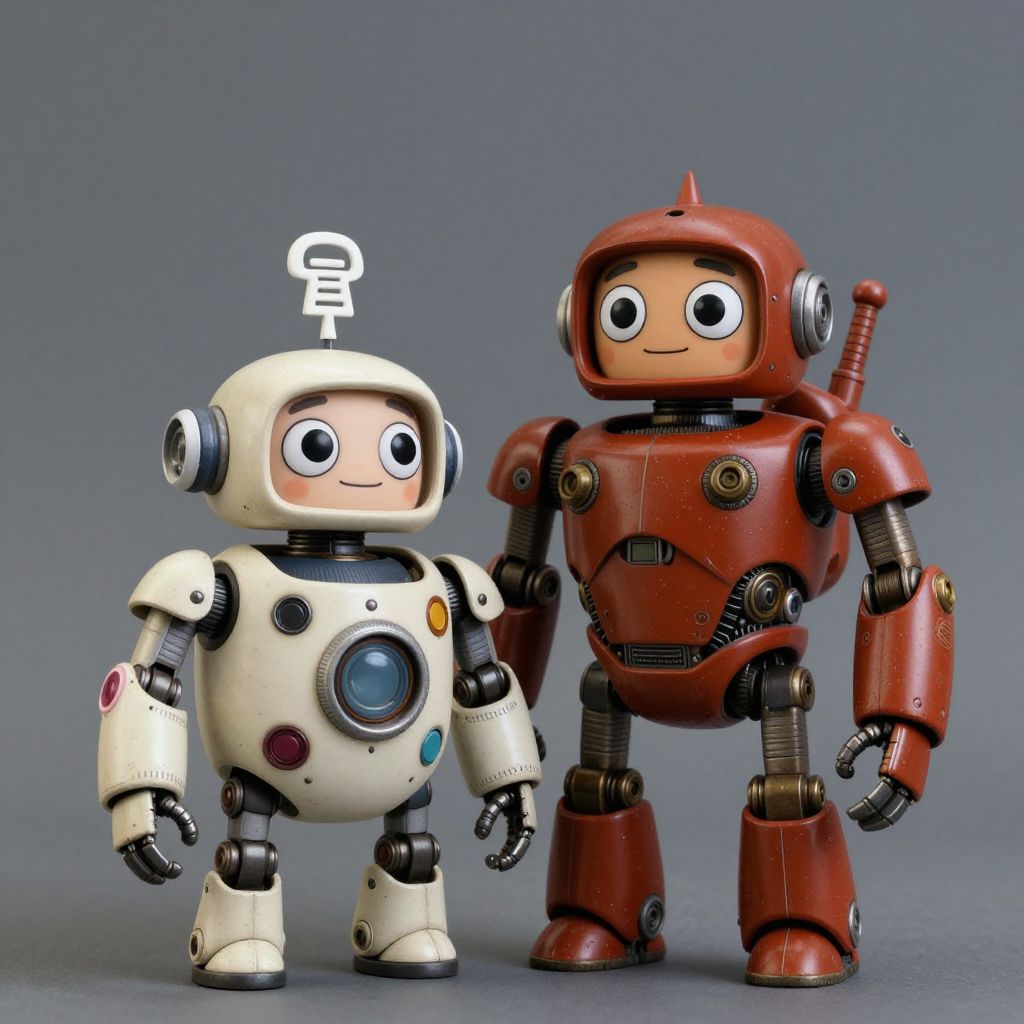 In this captivating image, two adorable robots, reminiscent of Hayao Miyazaki's whimsical style, stand side by side against a muted gray background. The robot on the left, with a round, cream-colored body adorned with various mechanical components and a small, round head featuring large, expressive eyes, exudes a sense of charm and innocence. Its companion, on the right, boasts a more robust, reddish-brown body with intricate mechanical details and a larger, more expressive head. Both robots are equipped with antennas and have a playful, almost childlike appearance. The robot on the left has a small, floating, white character on its head, adding to the whimsical atmosphere. The overall composition is balanced, with the robots positioned close together, creating a sense of camaraderie and shared adventure. The detailed textures and vibrant colors of the robots' bodies, combined with their expressive eyes and mechanical components, evoke a sense of wonder and curiosity, inviting the viewer to imagine the stories and adventures these charming characters might embark upon.
