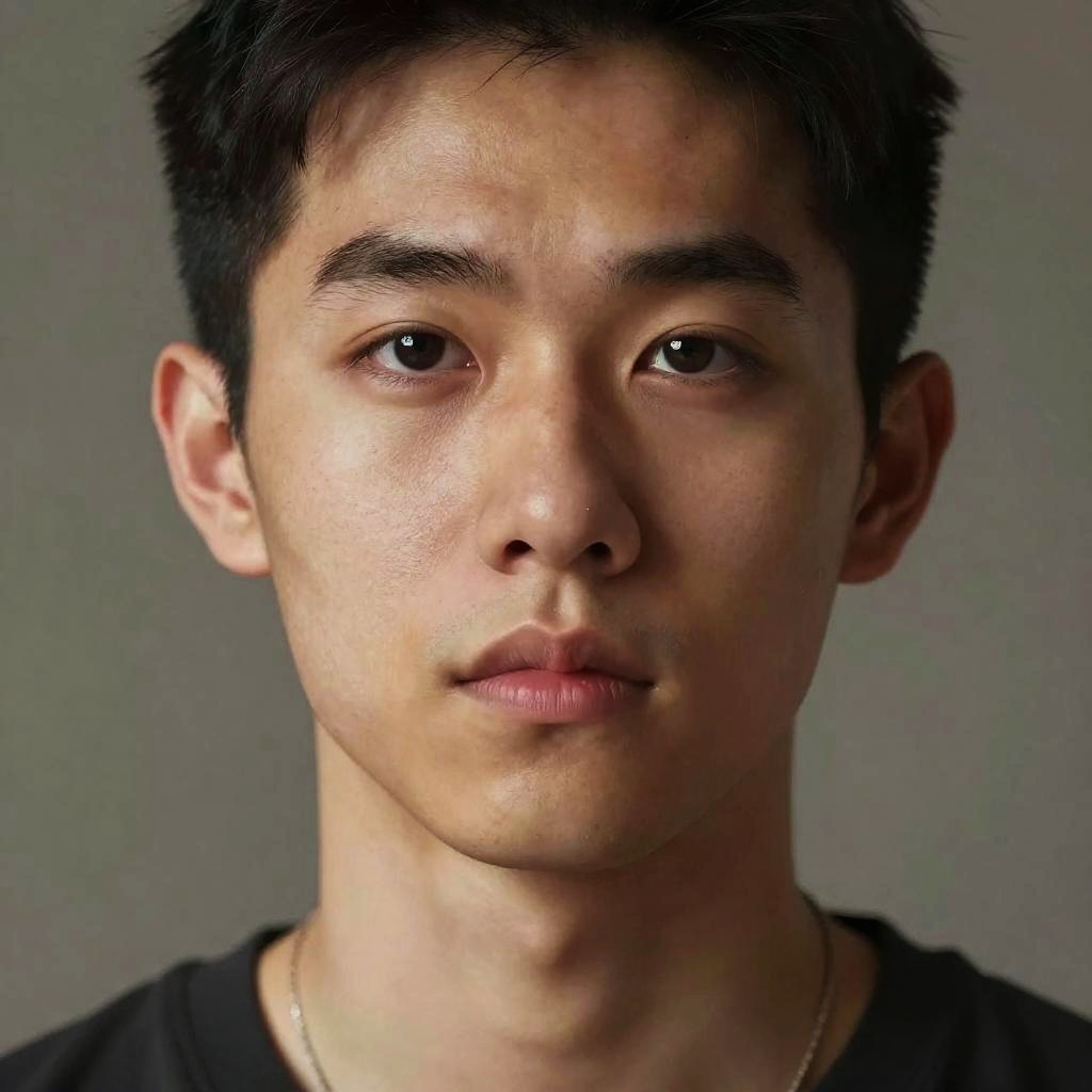 Close-up photorealistic portrait of a young Asian man with clear textured skin and expressive eyes. The subject is wearing a modern casual black shirt and a thin necklace. Soft natural lighting and shadows highlight facial features against a plain neutral background.