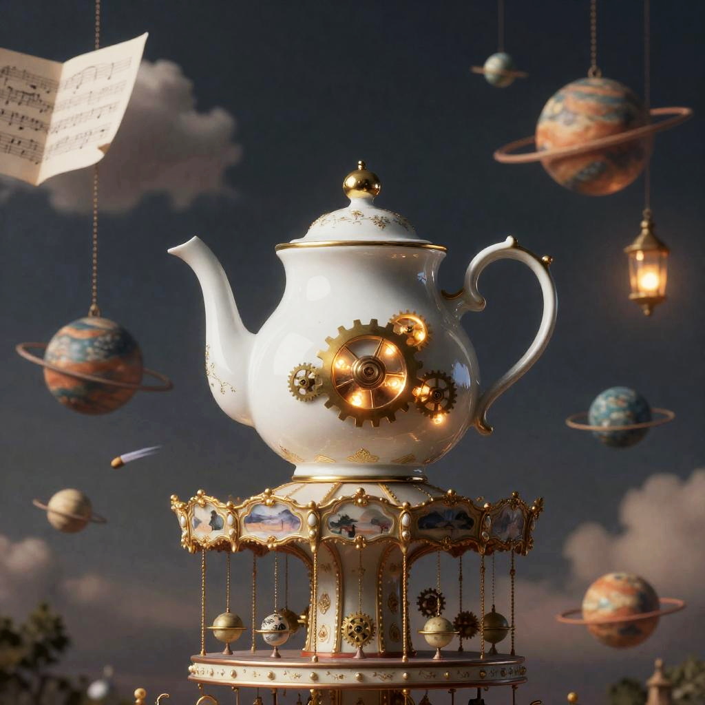 A surreal illustration of a porcelain teapot at the center of a carousel of tiny orbiting planets, with miniature moons on gilded chains, ribboned comet tails, and tiny glowing brass gears whirring inside the teapot's spout, in a dusky twilight sky stitched with floating sheet-music clouds and suspended lanterns, created in surreal baroque illustration with ornate textures and luminous accents, dreamlike and captivating