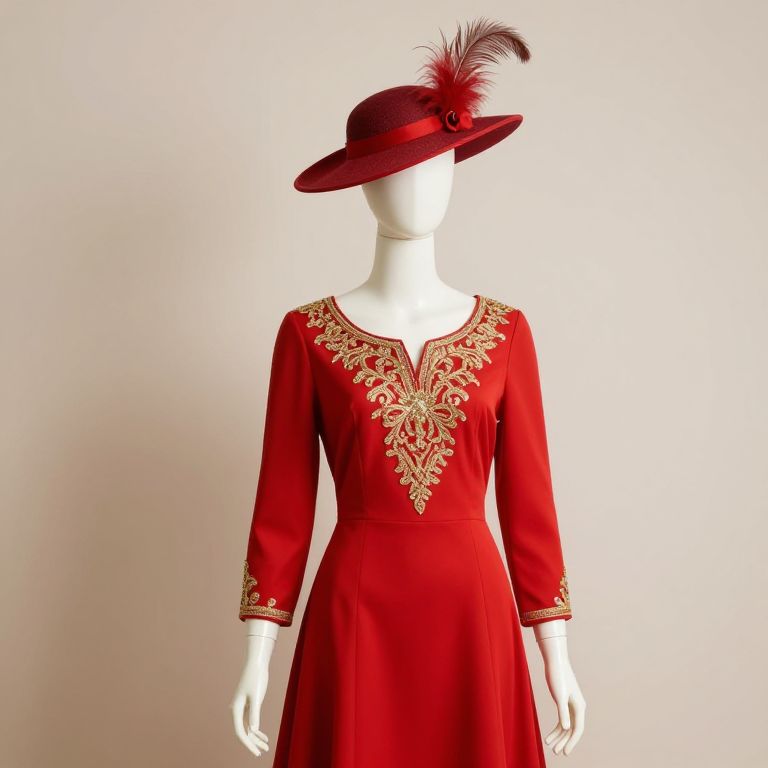 Mannequin wearing a red dress with gold embroidery and a hat with a feather on top.
