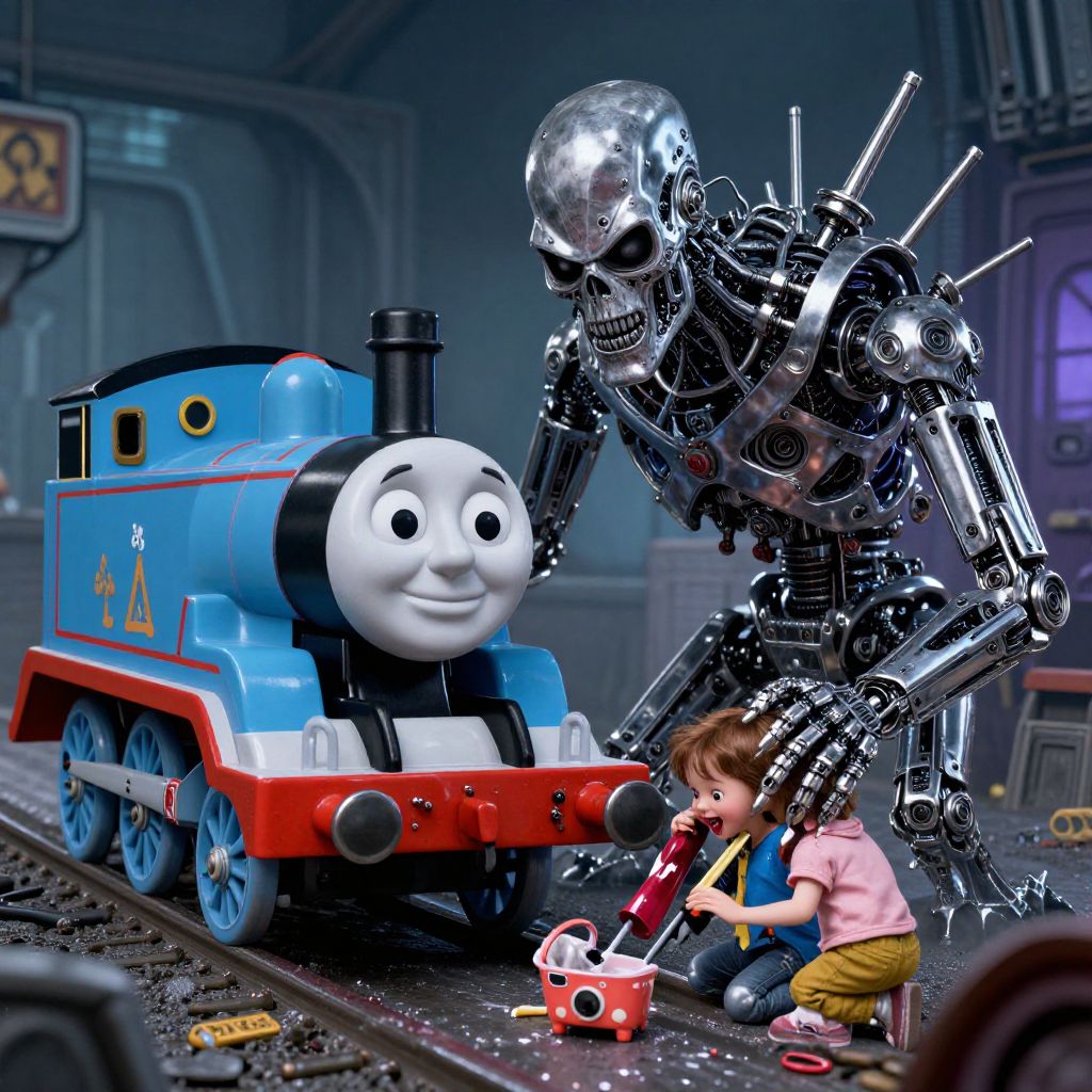 Sound Design Thomas the Tank Engine as the Terminator villain in a horror movie who survives by eating children, nightmare, metallic colors, cyborg, Sci-Fi,