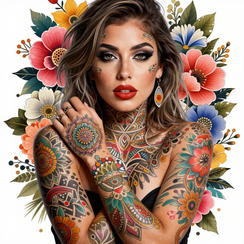 A vibrant digital artwork featuring a woman adorned with intricate mandala-inspired tattoos and floral elements, blending traditional and modern aesthetics in a colorful, high-definition style reminiscent of Lydia Eloff's mixed media approach.