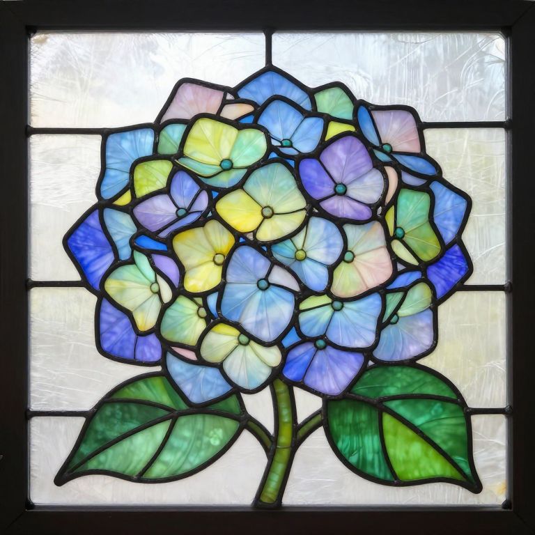 Neo-Traditional a French hydrangea, stained glass, in the style of Carl barks, pastel colors, colorful smooth colors,