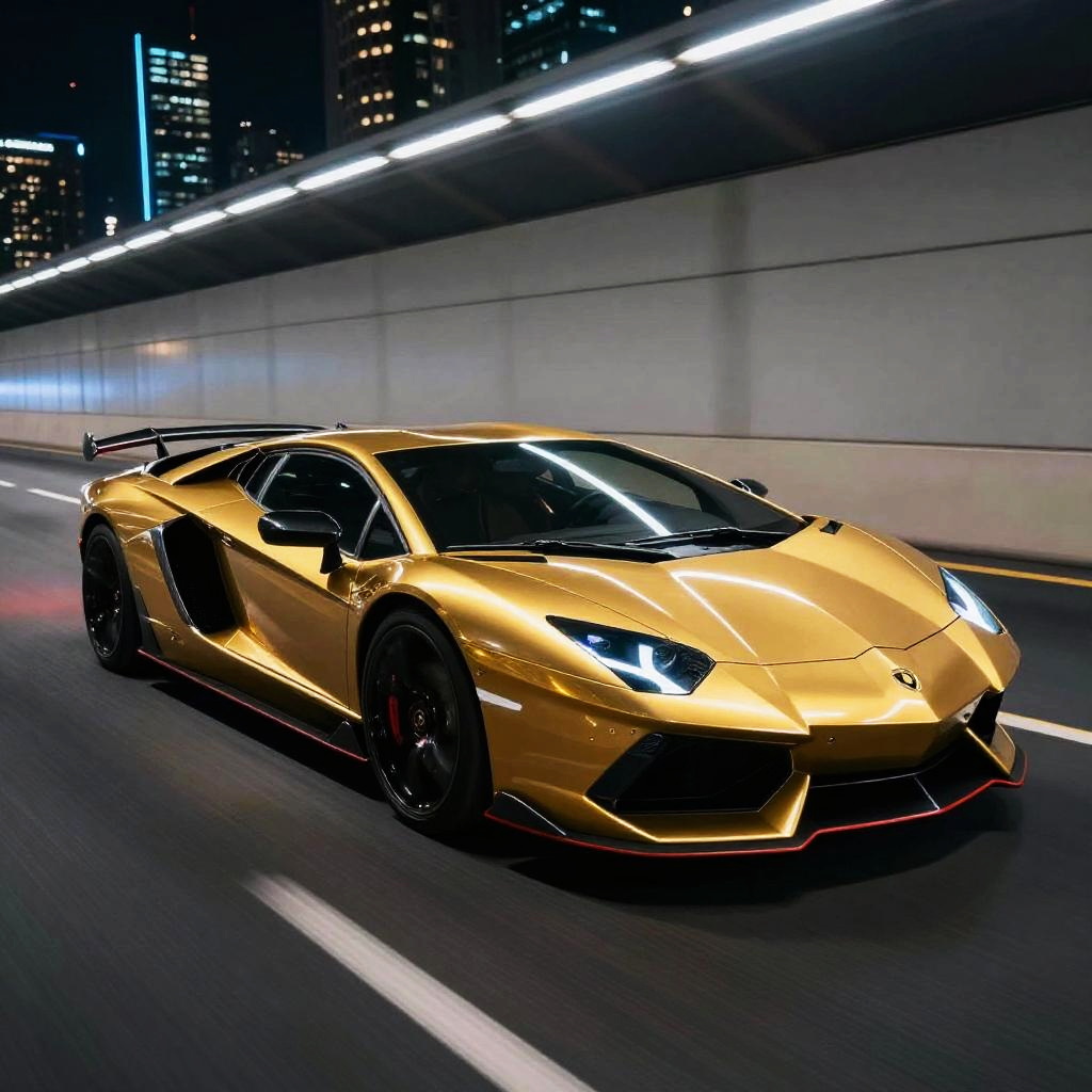 Neon gold Lamborghini speeding through a neon-lit tunnel, motion blur highlighting the car’s sharp edges and reflective surfaces, glowing lines tracing the contours, high-energy scene with futuristic cityscape in the background, intense lighting contrast.