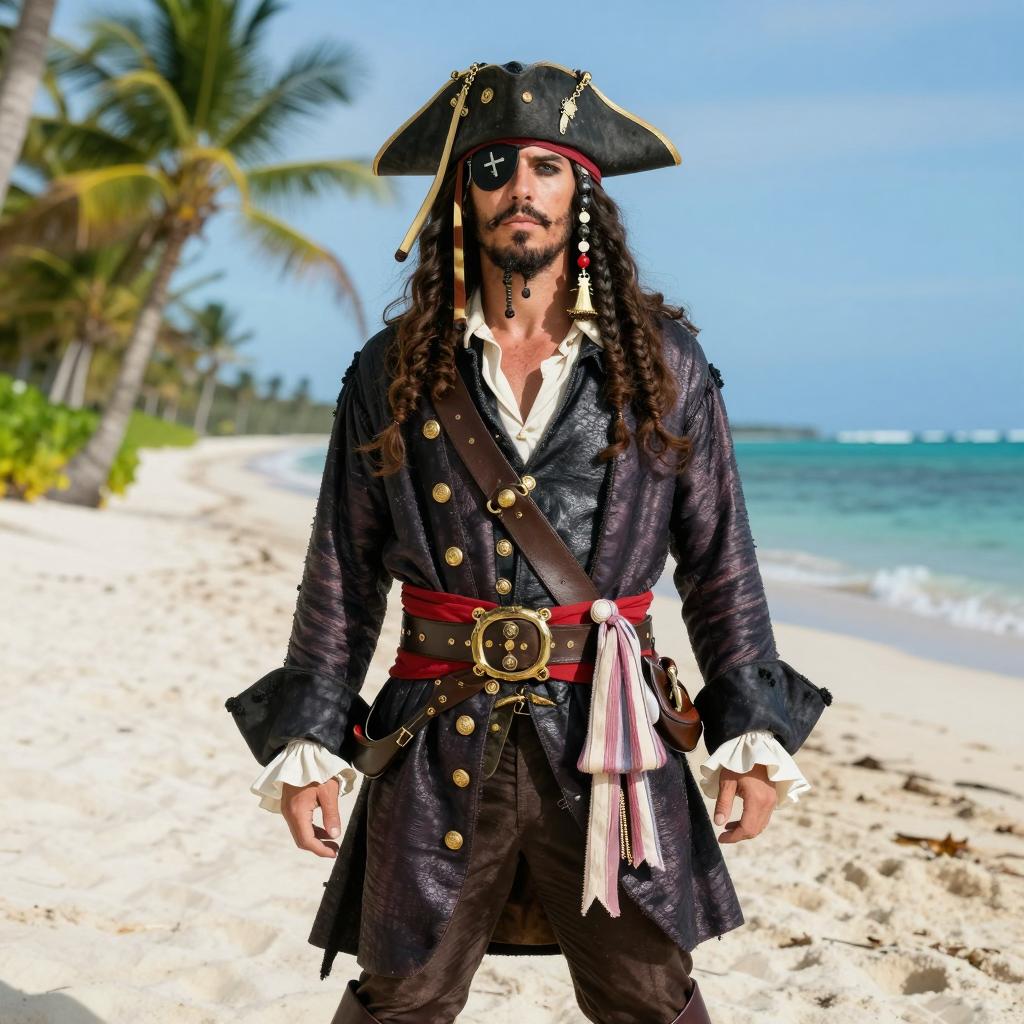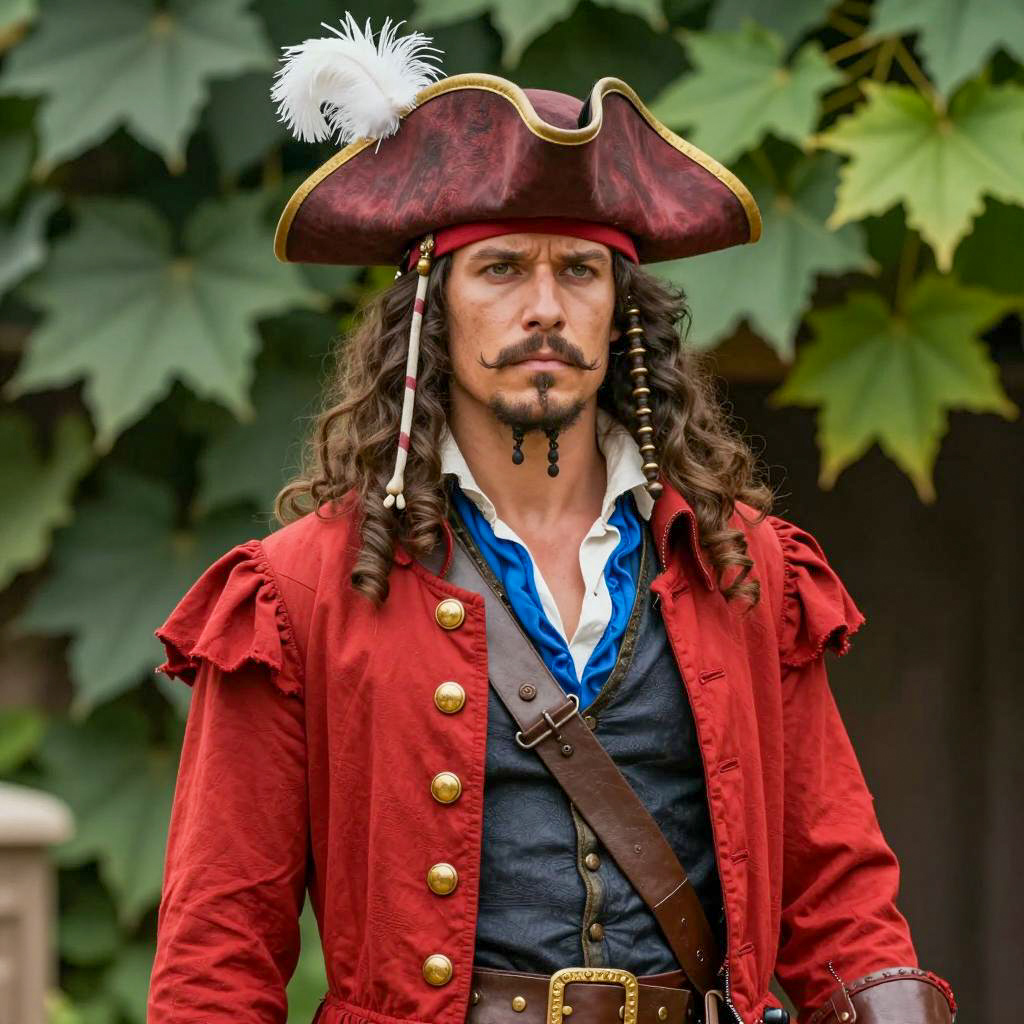 Caribbean pirate costume, photorealistic, pirate man, standing, front view, full body, elaborate pirate costume, red shirt, blue sleeves, brown belt, green pants, brown boots, large tricorn hat with skull emblem, long dreadlocks, full beard, stern expression, stone wall background, palm leaves, daytime, detailed ures, realistic lighting, outdoor setting, movie still, high detail, costume character, traditional pirate attire, historical fantasy, adventure theme