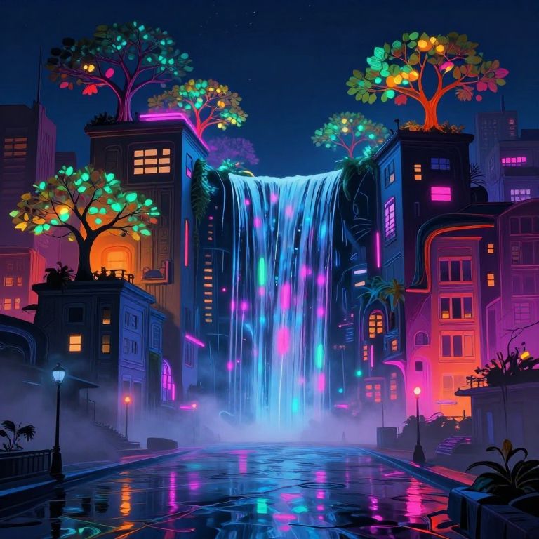 Surreal Neon Urban Waterfall Cityscape